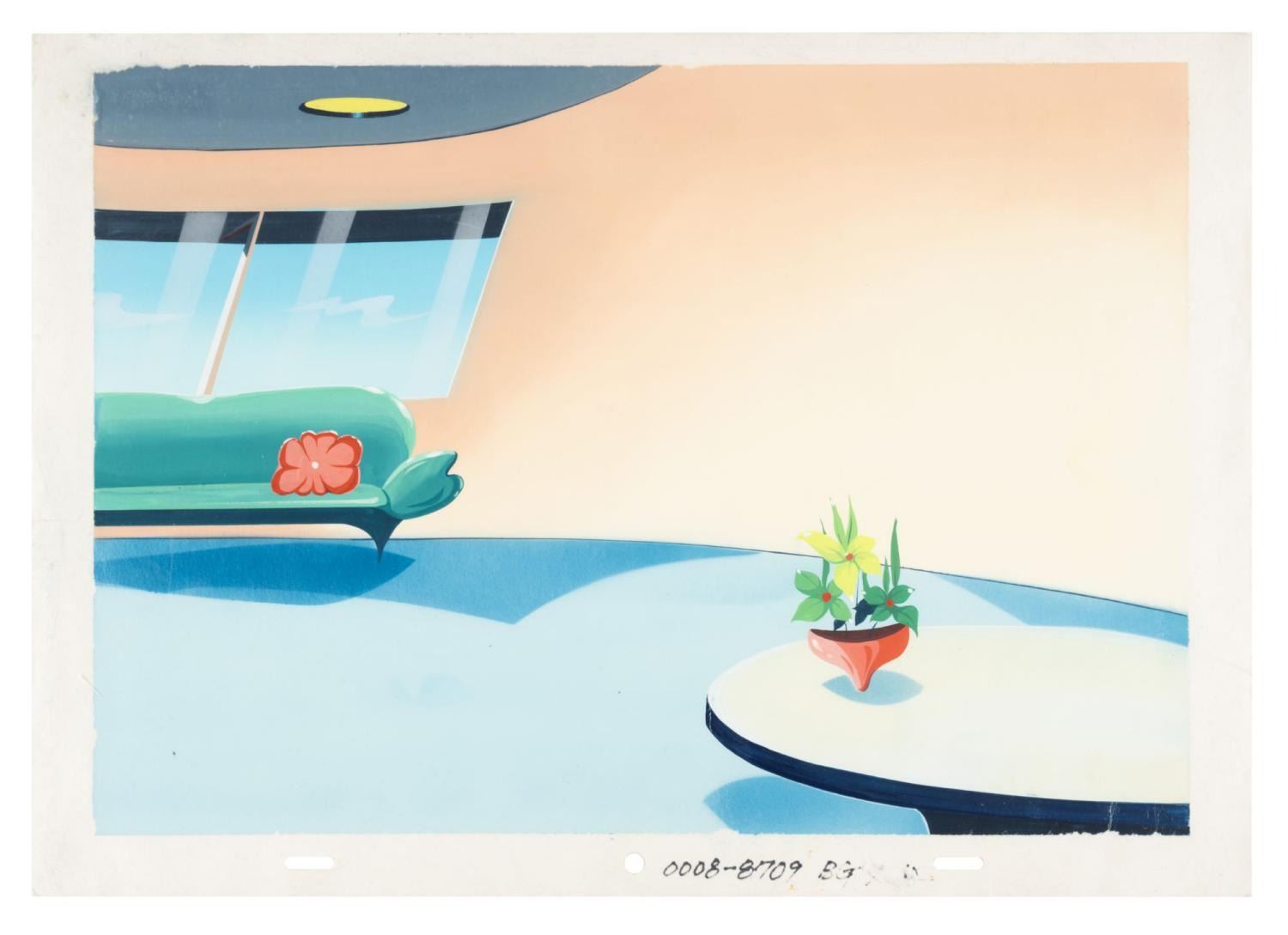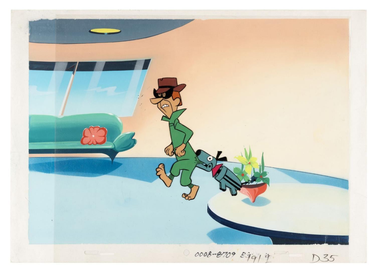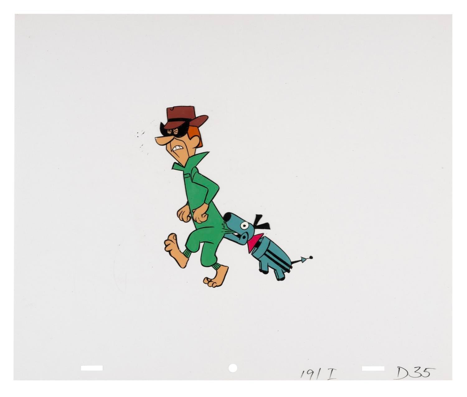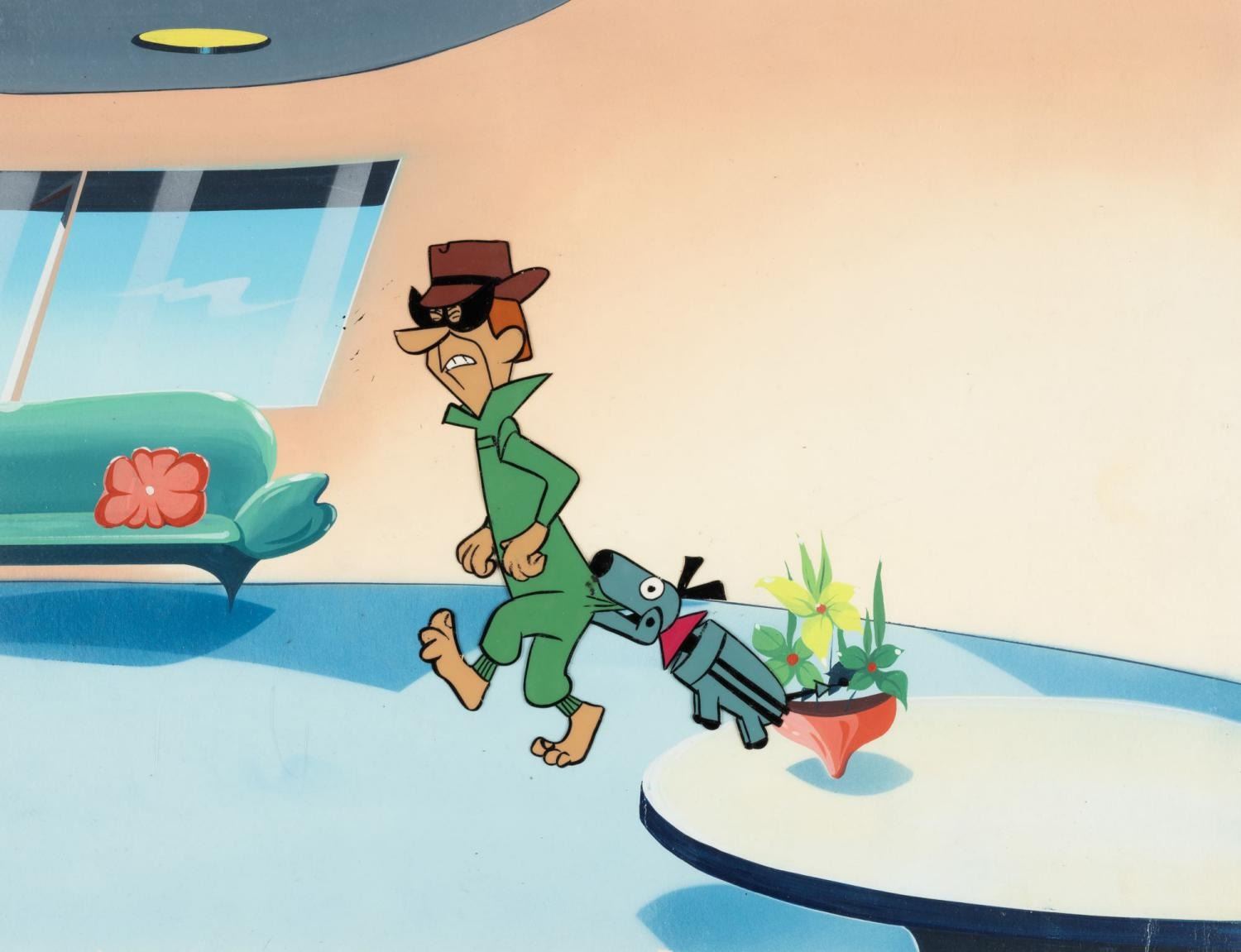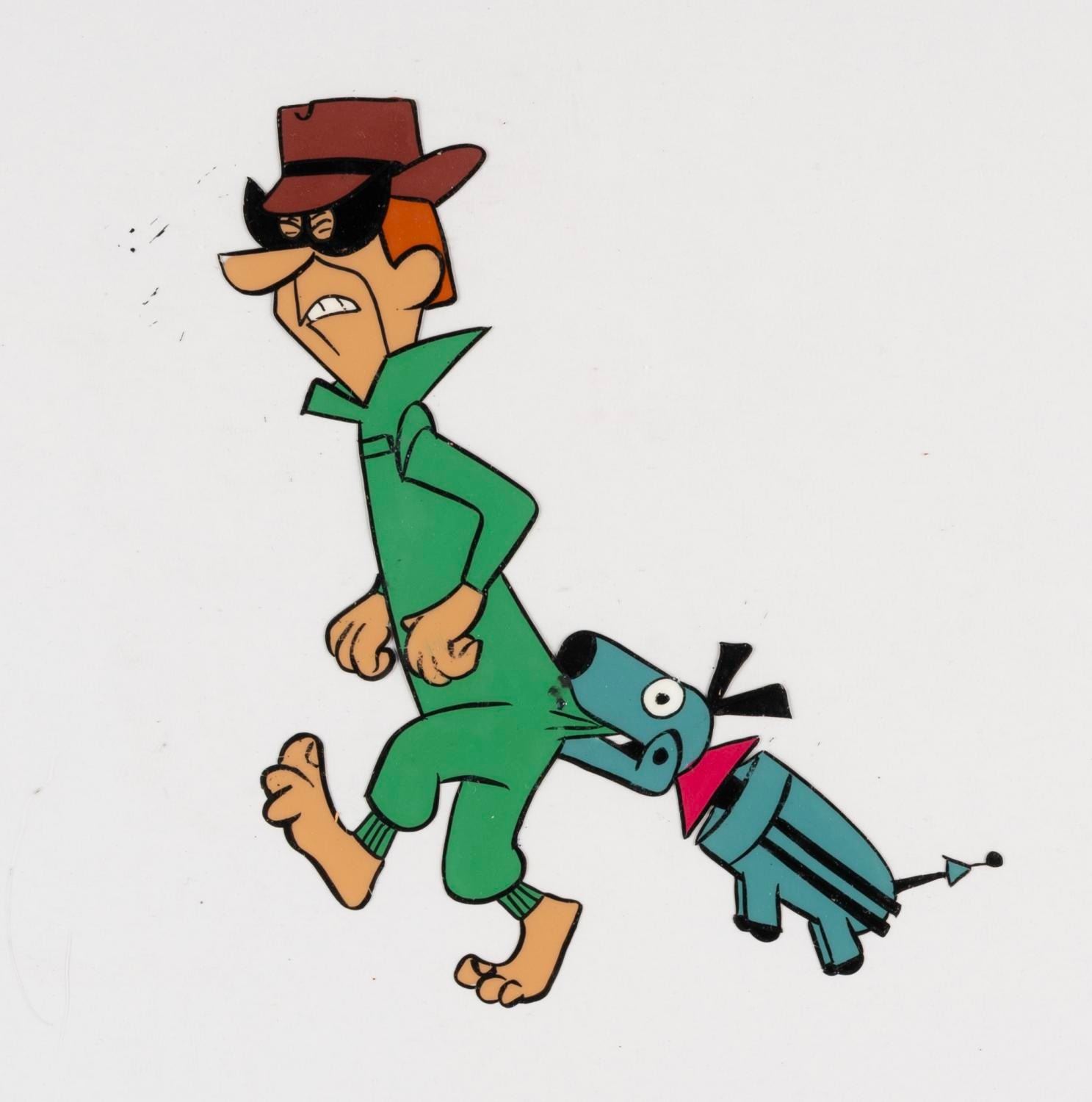 (Hanna-Barbera, 1962/80s) An original Jetsons cel from the 1962 episode "The Coming of Astro" with an original background from the 1980s series. The cel has a character size of 5.25" x 4.5" on 10.5" x 12.5" acetate and is in very good condition with very small spots of paint loss, and small flecks of paint transfer from another cel. The background accomplished in gouache measures 9.5" x 13.75" on 10.5" x 15" paper and displays in very good condition, with rough edges from production tape removal, and two tiny spots of soiling.