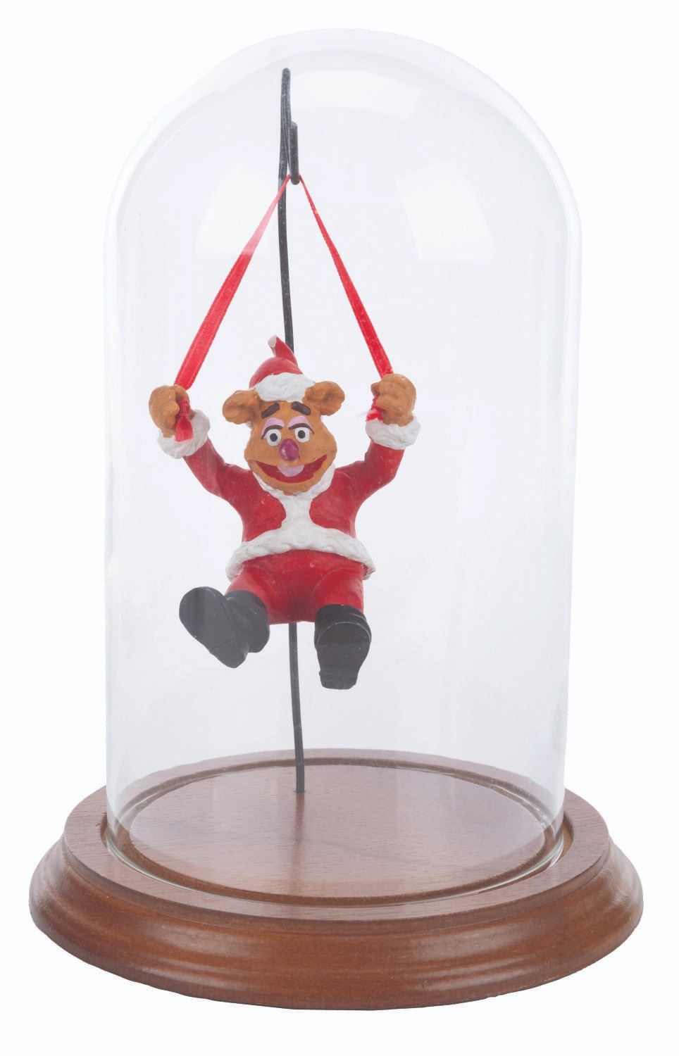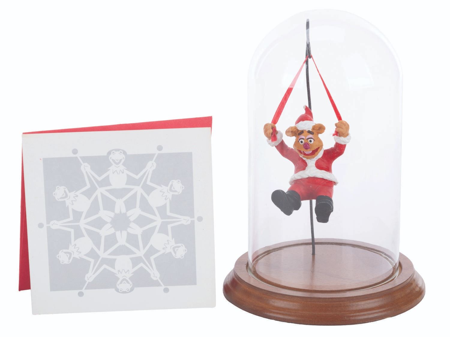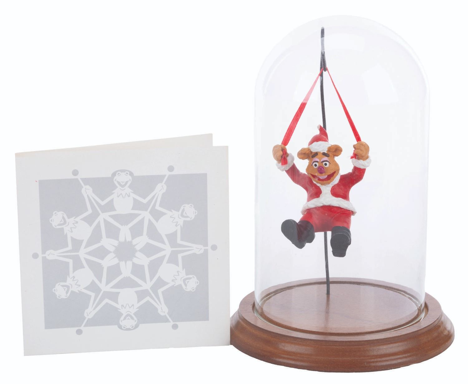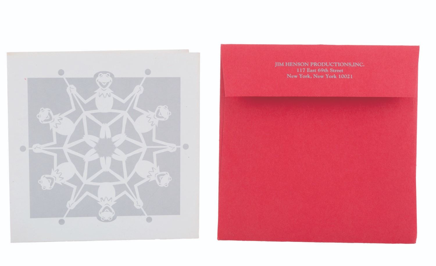(Henson, 1990) A Santa Fozzie Bear Christmas ornament and a card featuring Kermit the Frog gifted to Jim Henson Productions employees. Measuring 3” x 2.25” and 2” deep housed in a 7.75” tall and 5.25” display cloche, the resin ornament is in good condition with the tip of the hat broken off, while the card and envelope measuring 4.75” x 4.75” are in fine, unused condition.