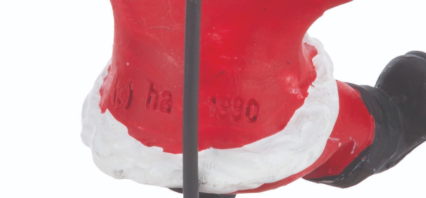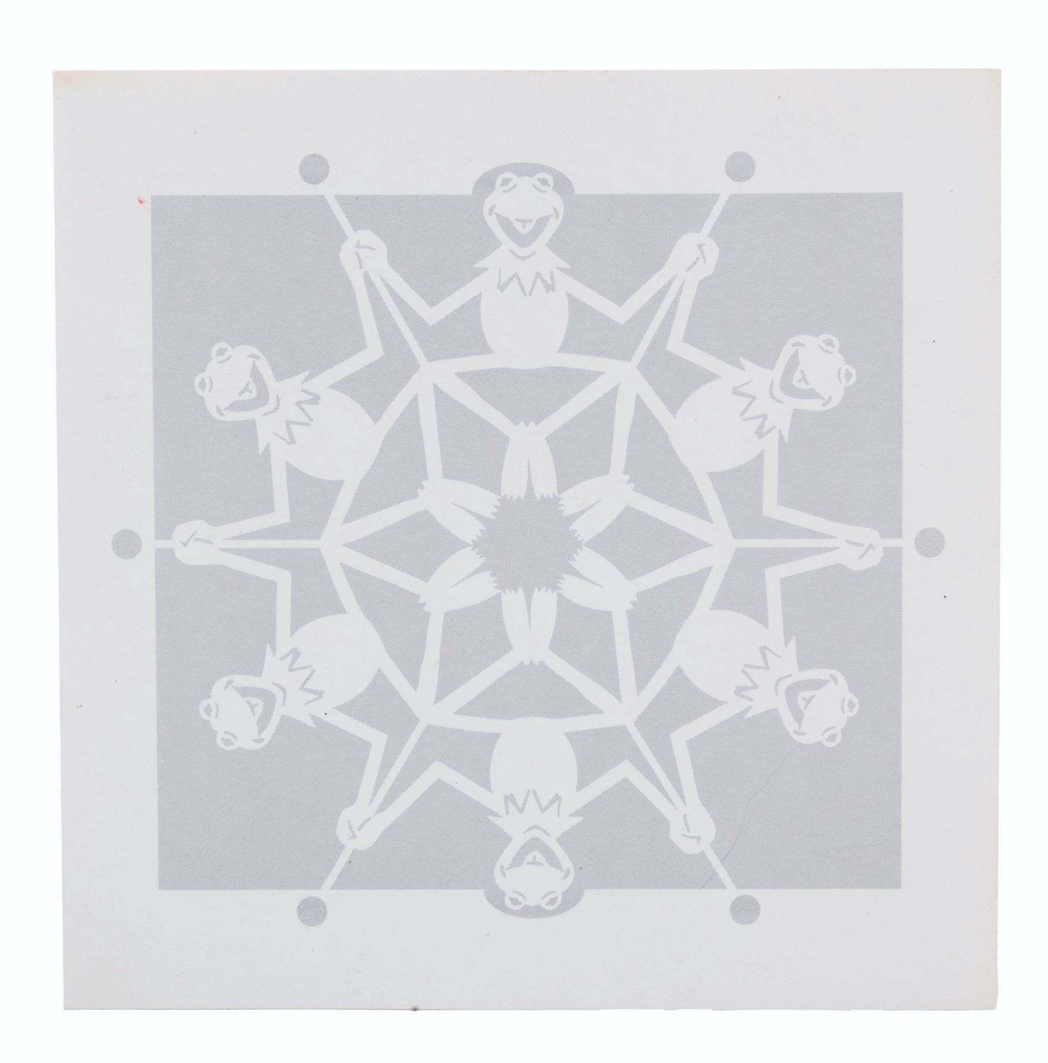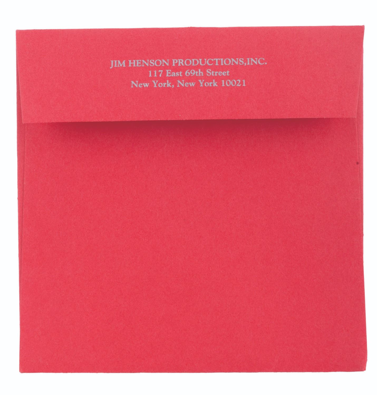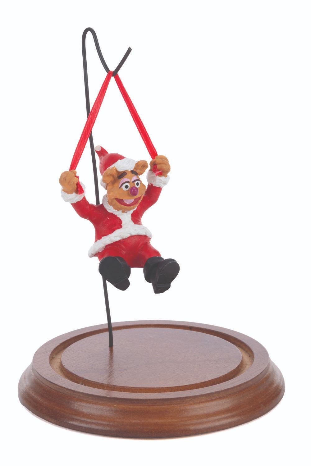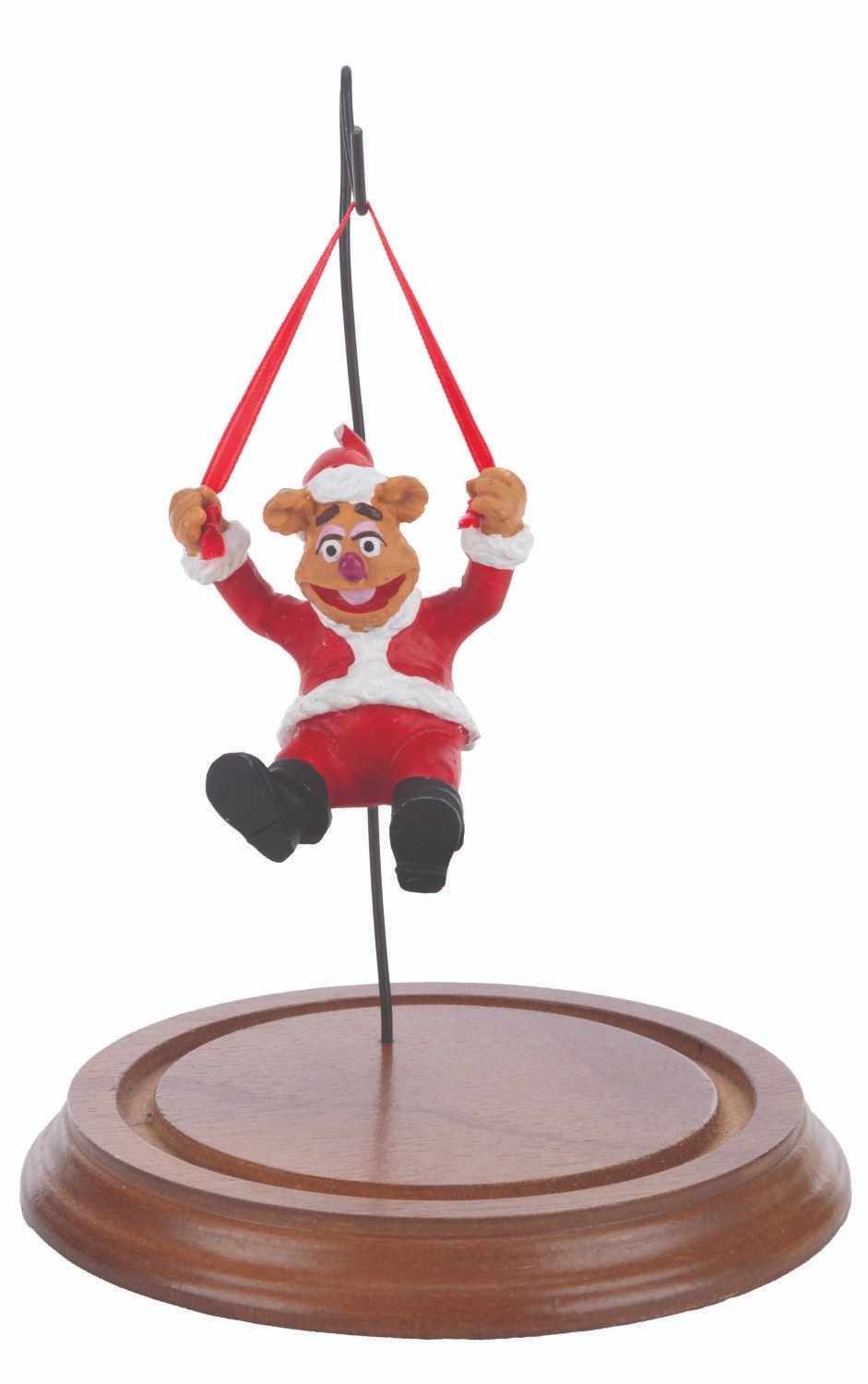 (Henson, 1990) A Santa Fozzie Bear Christmas ornament and a card featuring Kermit the Frog gifted to Jim Henson Productions employees. Measuring 3” x 2.25” and 2” deep housed in a 7.75” tall and 5.25” display cloche, the resin ornament is in good condition with the tip of the hat broken off, while the card and envelope measuring 4.75” x 4.75” are in fine, unused condition.