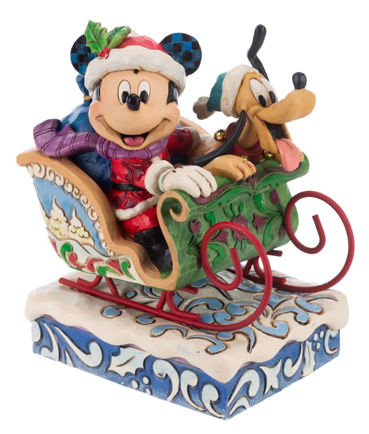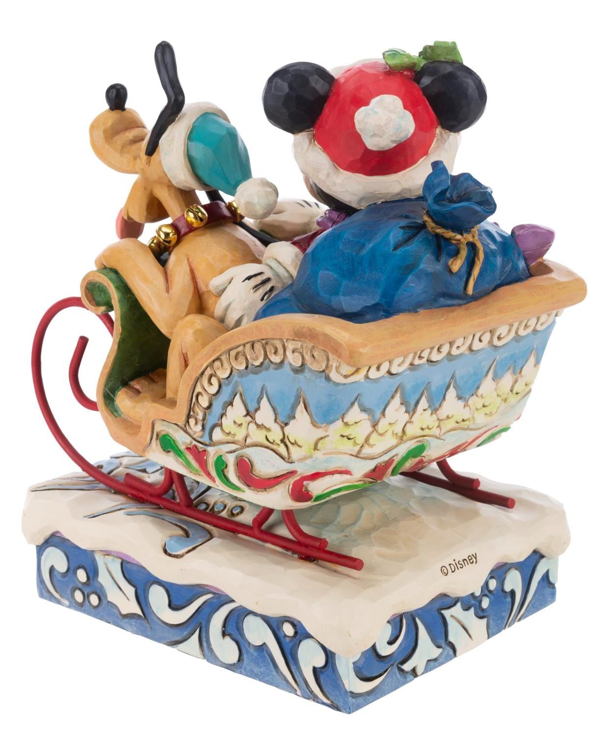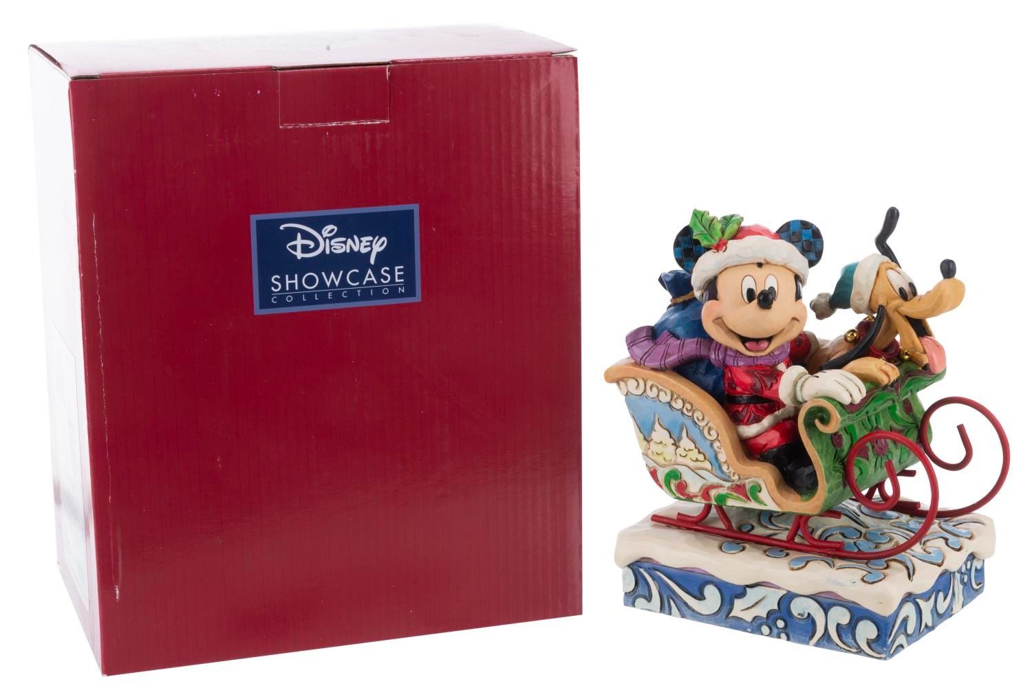(Enesco, 2000s) A Disney Traditions figurine of Mickey and Pluto titled"Laughing All the Way." The resin holiday figurine was designed by Jim Shore and released by the Disney Showcase Collection. When wound, the musical feature plays"Jingle Bells." Measuring 4" x 5.75" x 6.75" the figurine is in fine condition.
