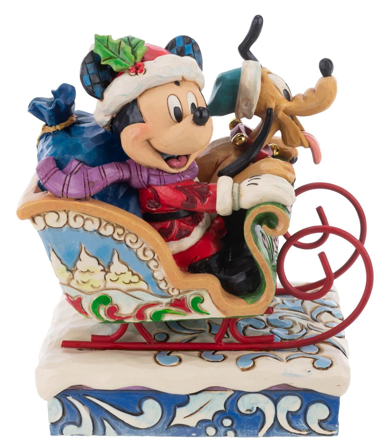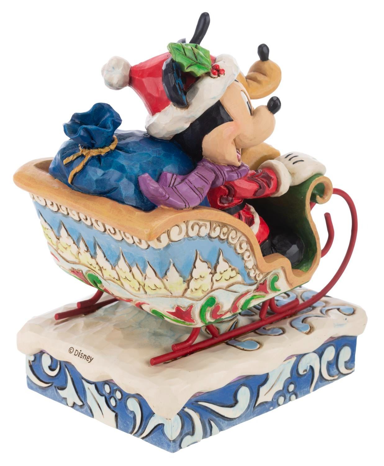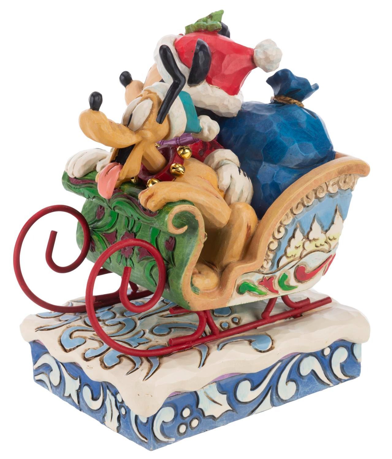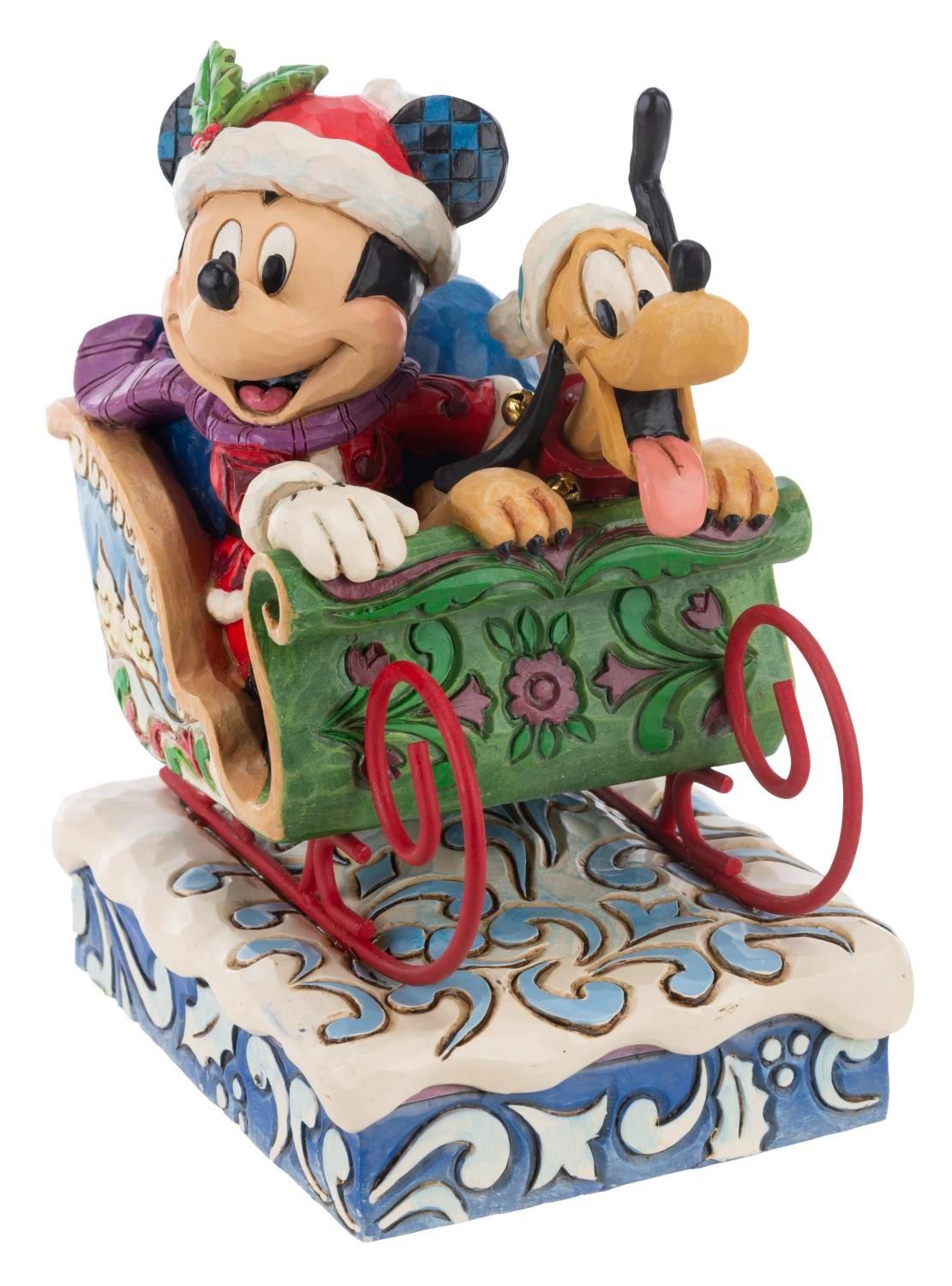 (Enesco, 2000s) A Disney Traditions figurine of Mickey and Pluto titled"Laughing All the Way." The resin holiday figurine was designed by Jim Shore and released by the Disney Showcase Collection. When wound, the musical feature plays"Jingle Bells." Measuring 4" x 5.75" x 6.75" the figurine is in fine condition.