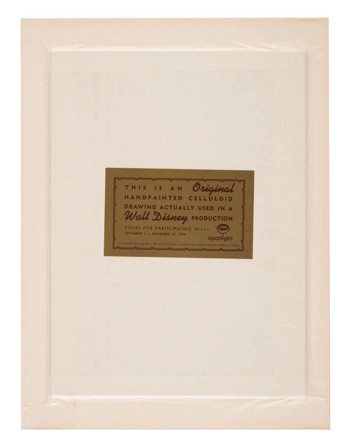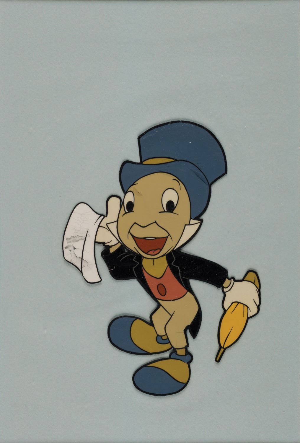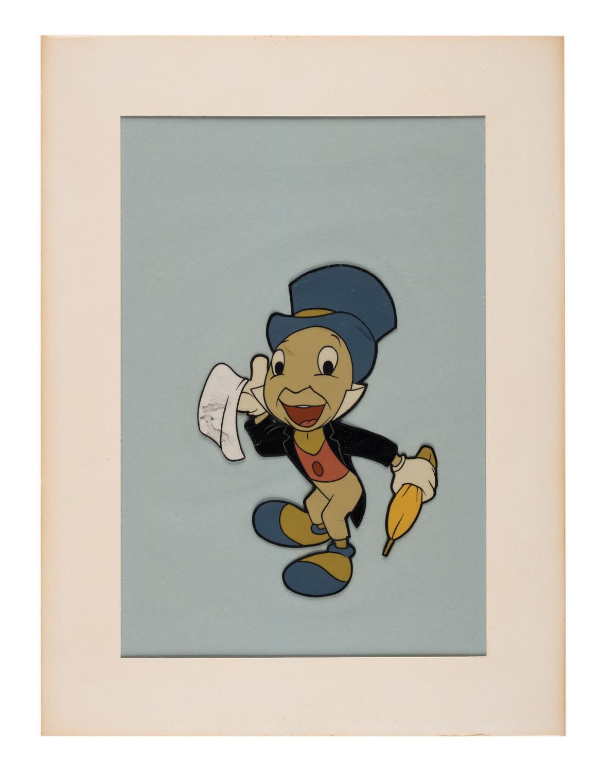 (Disneyland, 1959) An original hand painted production cel of Jiminy Cricket used in a Walt Disney television production. When production was completed, the cel was matted and offered during the Disneyland INA Spotlight promotion of 1959. The piece has a character size of 5.75"x4.25" on its 10"x7.5" cel sheet, and in good condition, exhibiting some cracking to Jiminy's face and handkerchief.