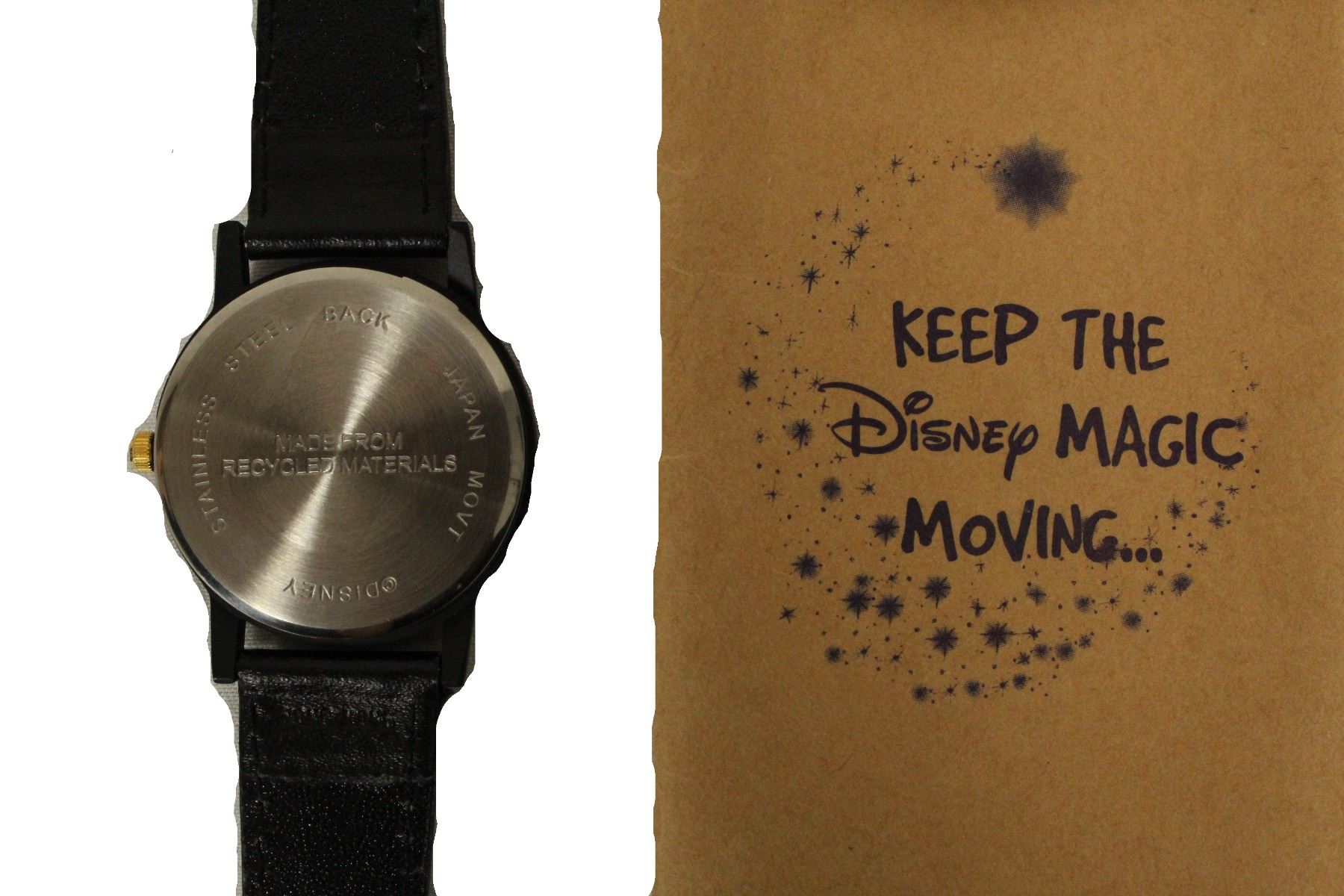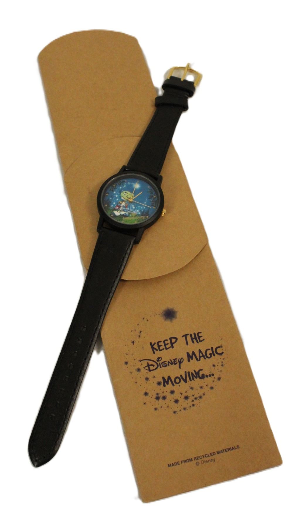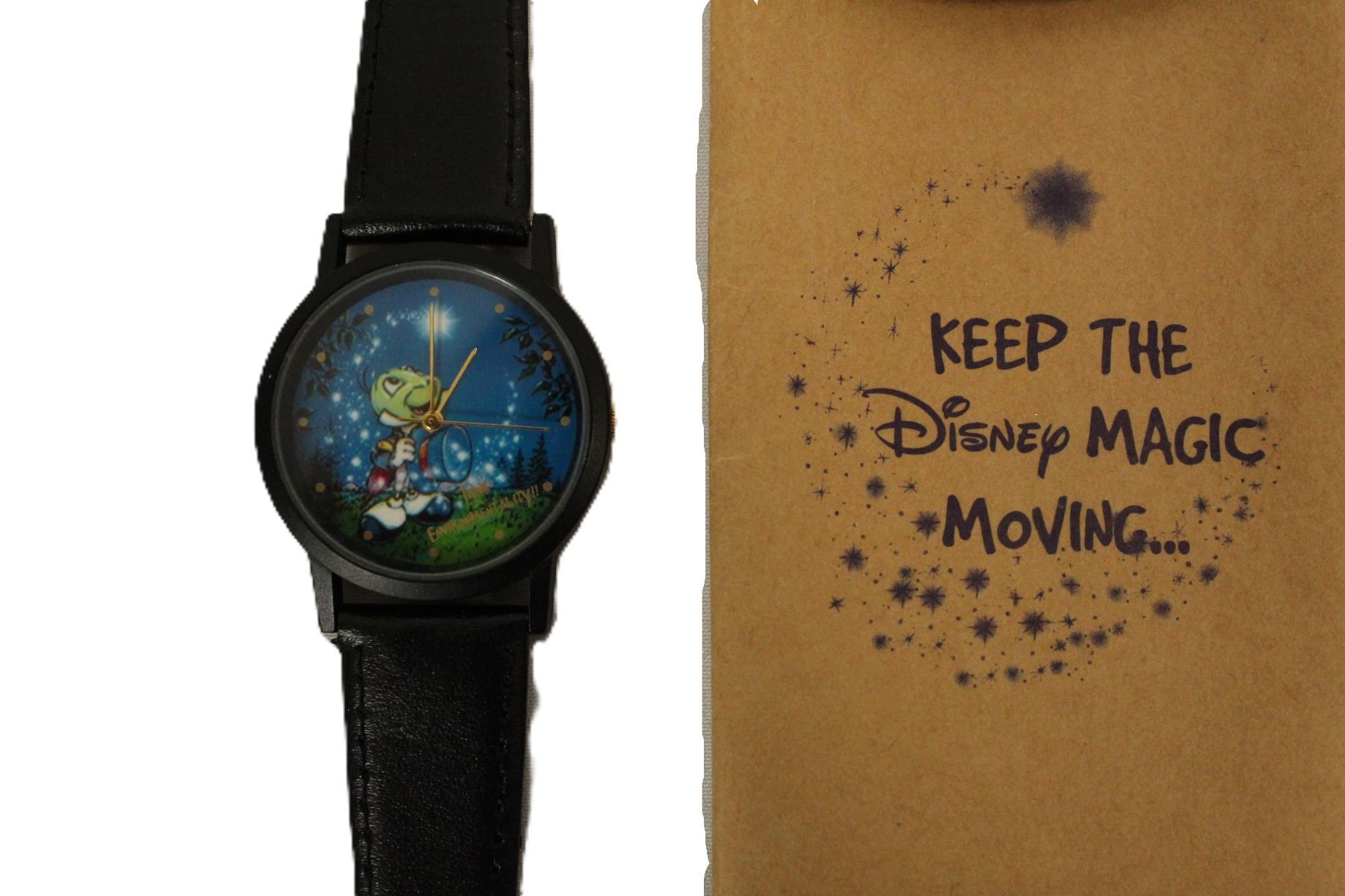 This is a superb cast member watch finished in black with a gold colored dial on a black band. The face has an image of Jiminy Cricket standing with a field of stars in the background staring at the Blue Fairy star with the phrase "Think Environmentality!!". The watch uses Japanese movement for its functionality. The watch appears to have never been worn.