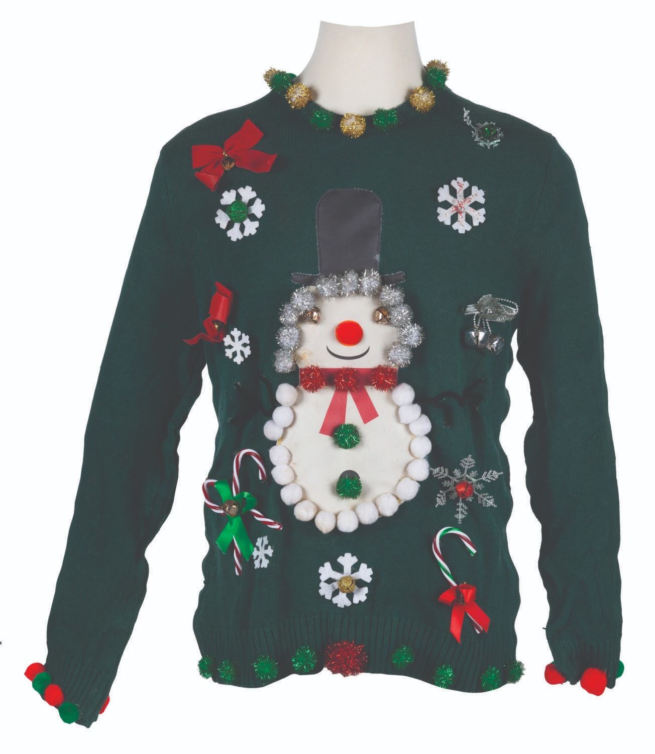 (Disneyland, 2014-2017) An ugly Christmas sweater prop from the Jingle Cruise holiday overlay of the Jungle Cruise. The sweater opens in the back with Velcro and can be seen in the Native Village section of the attraction, worn by one of the dancing Natives. Measuring 31” from collar to hem and 61.5” from sleeve to sleeve, the sweater displays in very good condition with typical wear and soiling from Park use, and oxidation to the jingle bells.