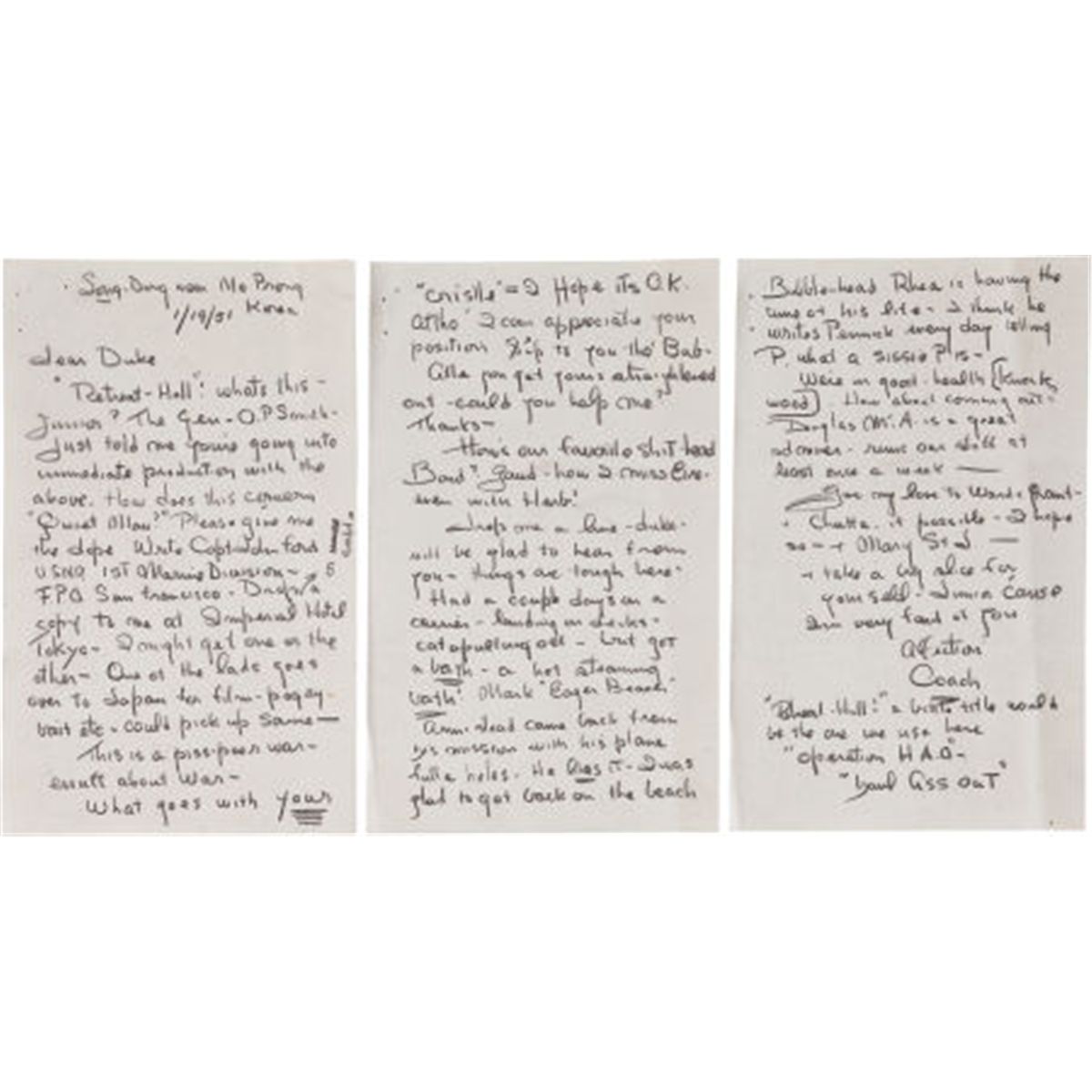 A John Ford Handwritten Letter, 1951. Written in pencil on three sheets of white paper, to "Duke," dated "1/19/51 Korea," a newsy letter touching on a few different subjects with highlights including: "...just told me you're going into / immediate production... / How does this concern Quiet Man? Please give me / the dope" and "This is a piss-poor war- / enuff about war" and "How's our favorite shit-head / Bond? Gawd - how I miss Eire," ending with "Give my love to Ward.../ & take a big slice for / yourself, Junior cause / I'm very fond of you / Affection / Coach;" a great note showing how close the two were professionally and personally.8" x 5"