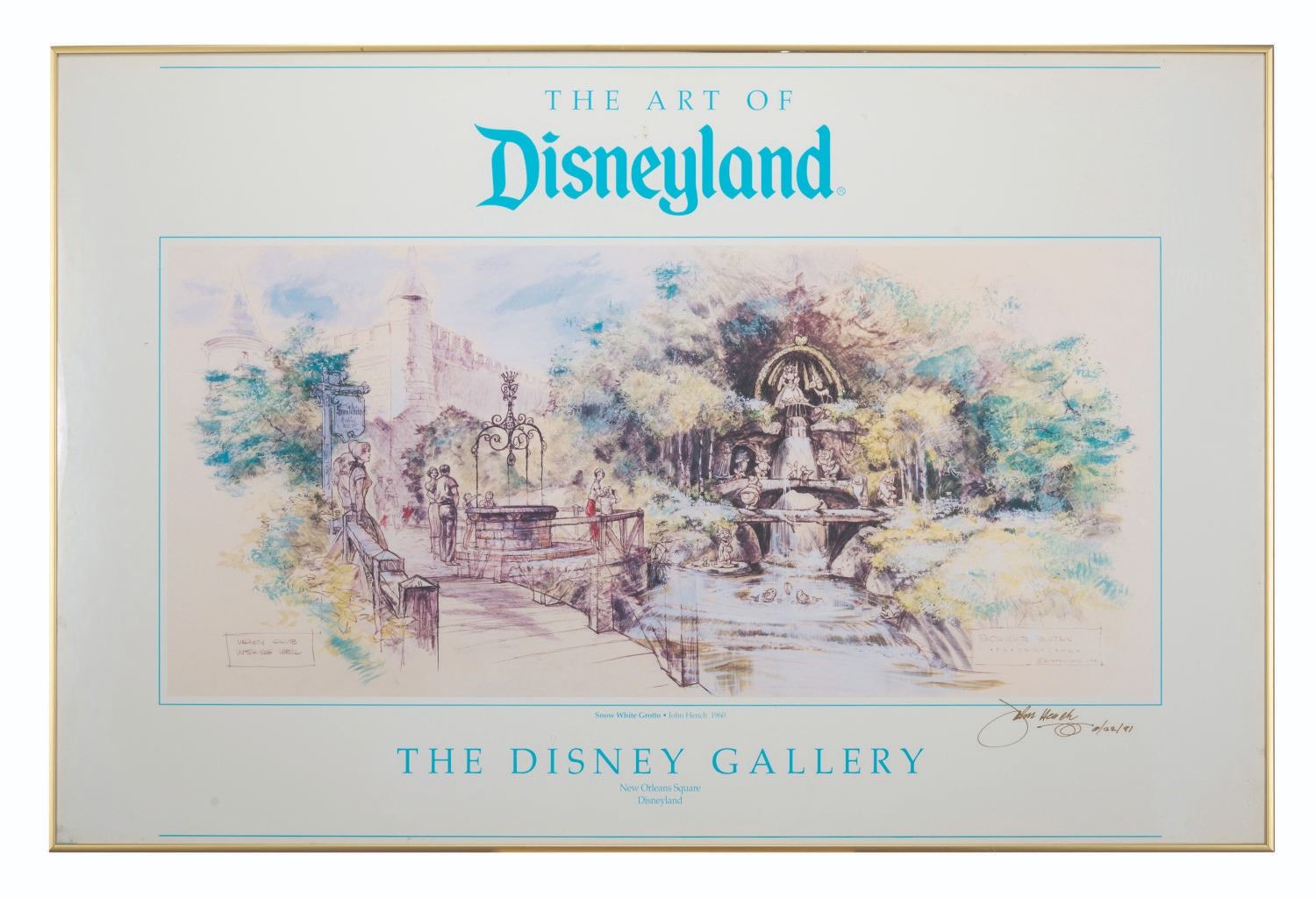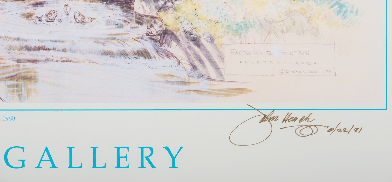 (Disneyland, 1991) A poster of a concept piece for the Snow White Grotto and Wishing Well, signed by John Hench. The print was released through The Disney Gallery as part of “The Art of Disneyland” series at a special event held on June 22, 1991. The piece is signed in gold ink by the artist and dated “6/22/91.” Measuring 39”x26”, the signed print is in very good condition with slight yellowing from age.