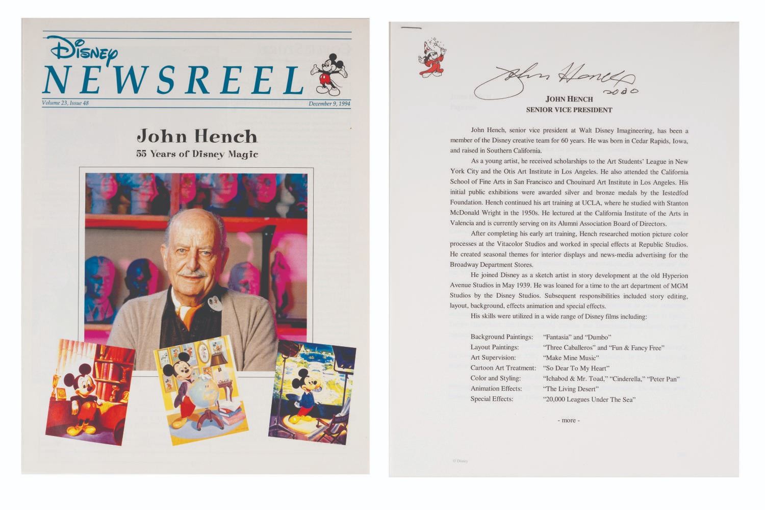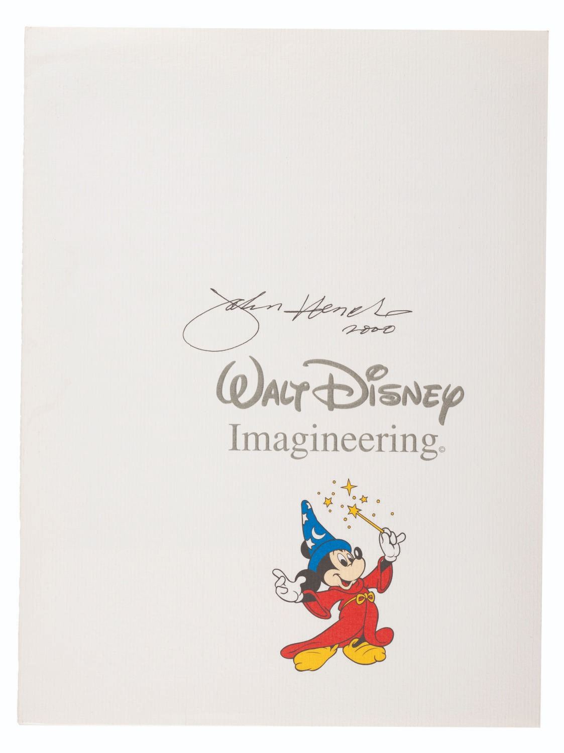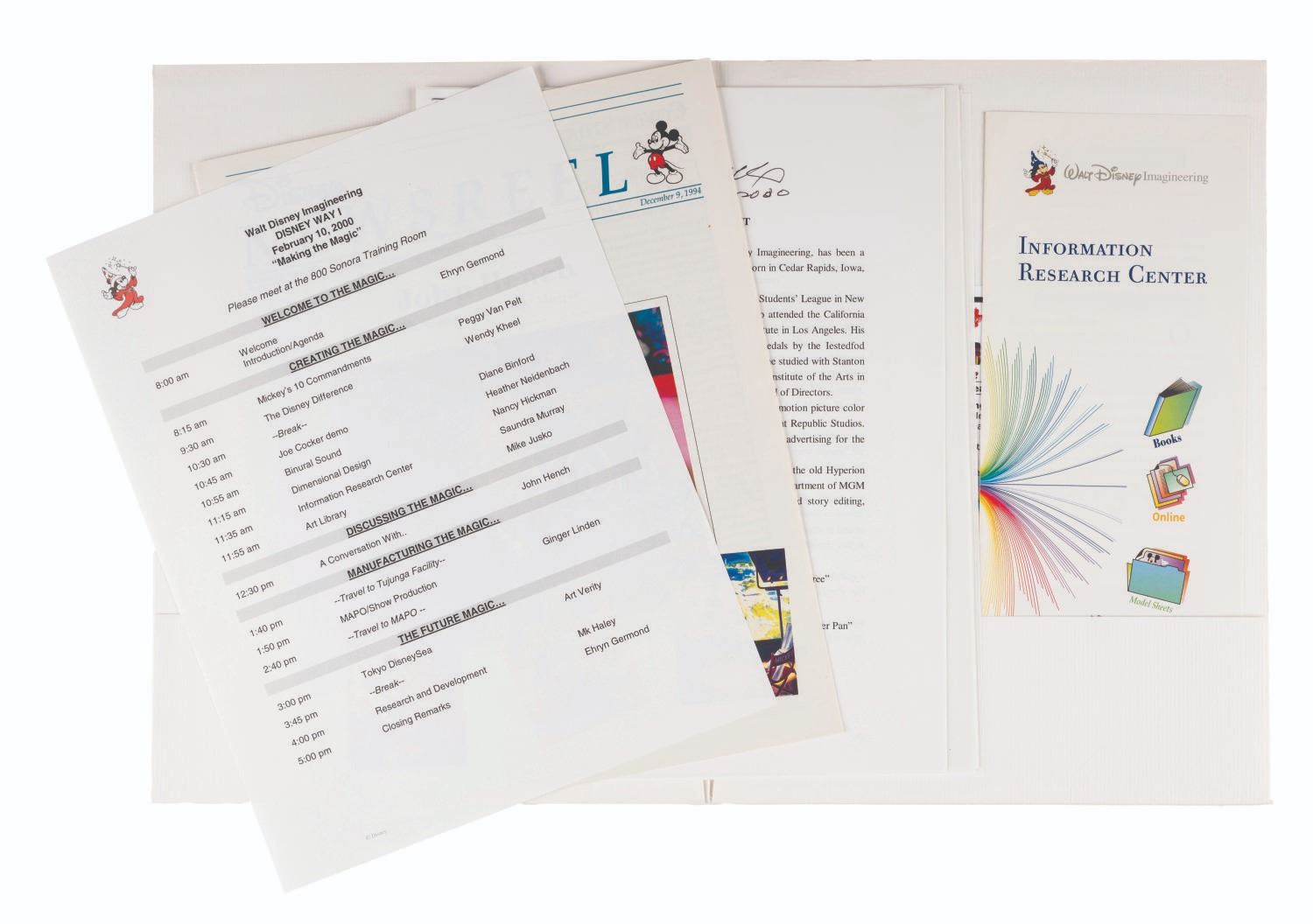 (WDI, 2000) A Walt Disney Imagineering conference folder signed by Disney Legend John Hench. Inside the folder are schedules for the conference, a biography signed by Hench, and a December 1994 Newsreel with Hench on the cover. Ranging in size from the 5.5” x 8” quick reference guide to the 9” x 12” folder, the items are in very good condition with light creases and handling wear.