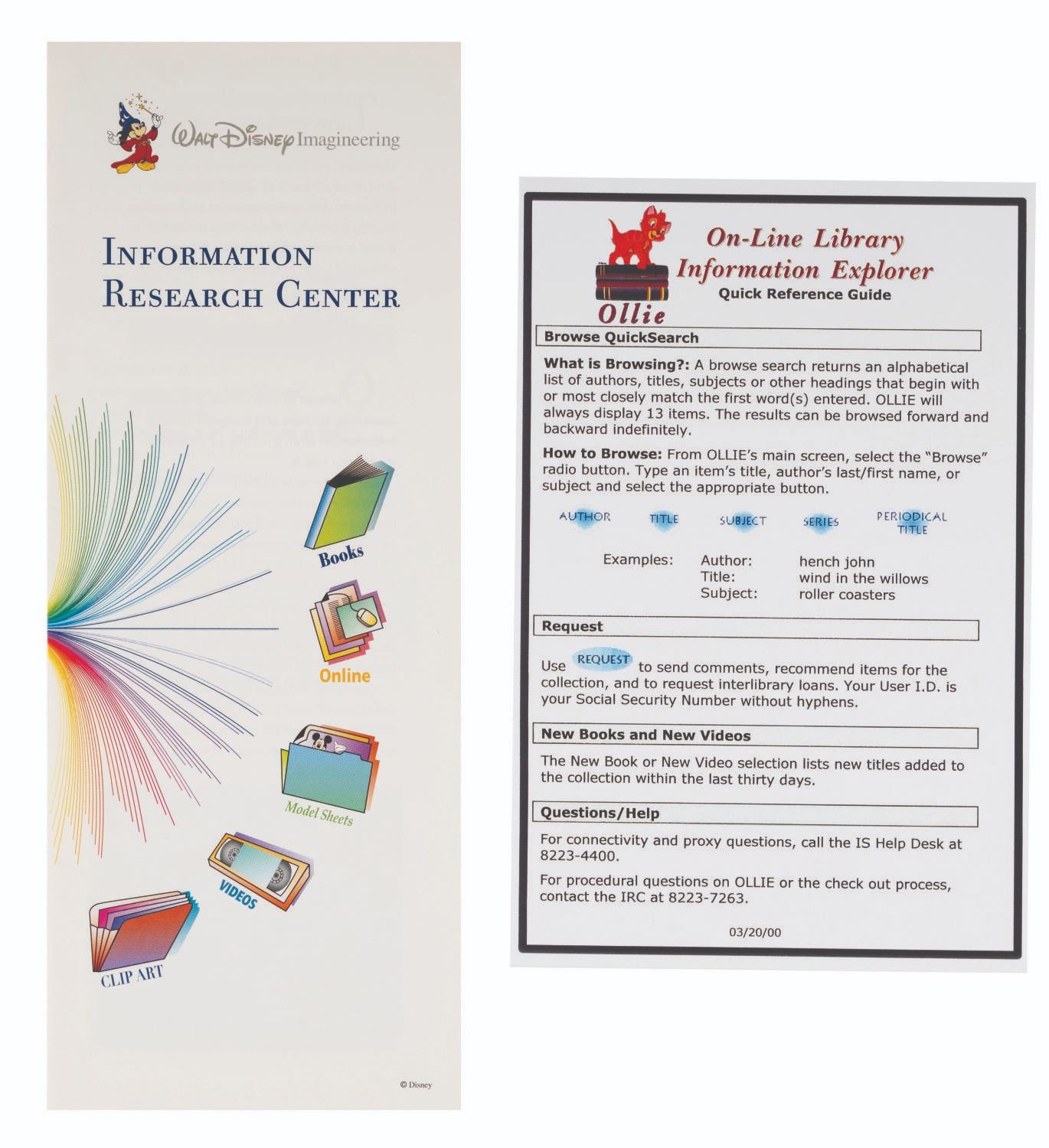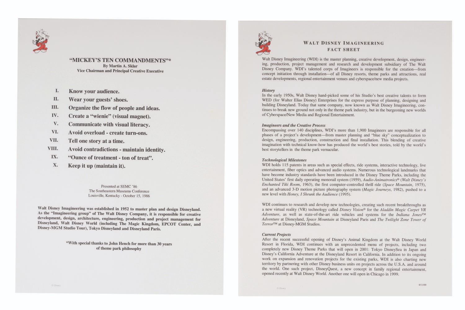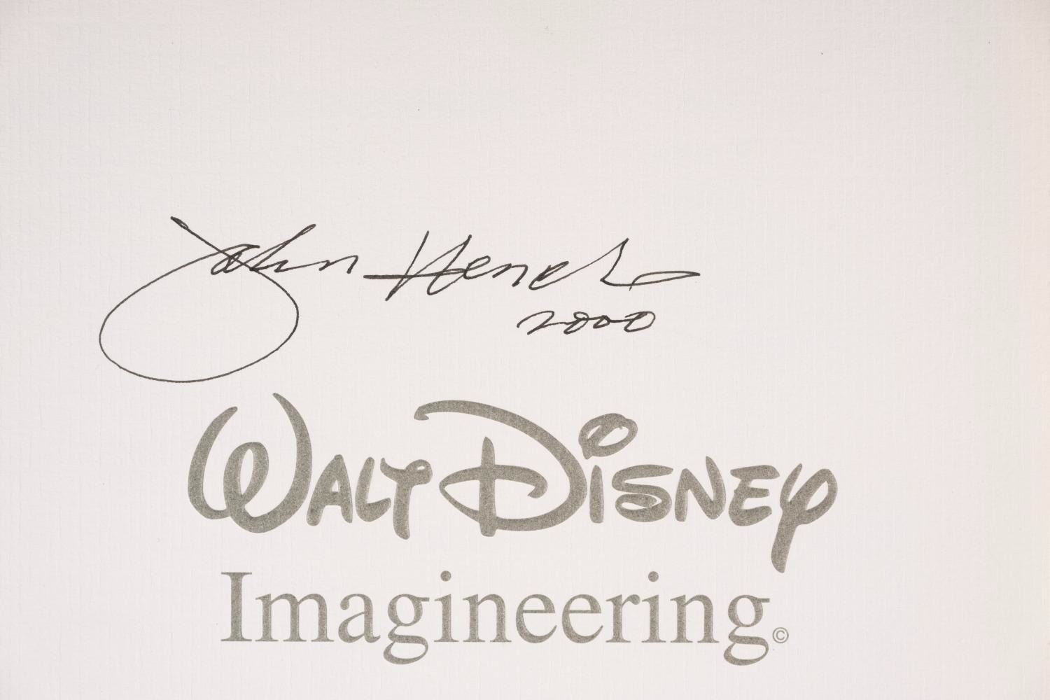 (WDI, 2000) A Walt Disney Imagineering conference folder signed by Disney Legend John Hench. Inside the folder are schedules for the conference, a biography signed by Hench, and a December 1994 Newsreel with Hench on the cover. Ranging in size from the 5.5” x 8” quick reference guide to the 9” x 12” folder, the items are in very good condition with light creases and handling wear.