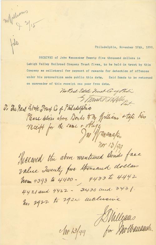 John Wanamaker. ANS. 1pp. 8" x 13". Philadelphia. Nov 13, 1899. An autograph note signed by famed merchant John Wanamaker that states: "To The Real Estate Trust Co of Philadelphia Please deliver above Bonds to Mr. Williams & take his receipt for the same & Oblige Jno Wanamaker". There is a typed statement above: "RECEIVED of John Wanamaker Twenty five thousand dollars in Lehigh Valley Railroad Company Trust fives, to be held in trust by this Company as collateral for payment of rewards for detection of offences under his proposition made public this date. Said Bonds to be returned on surrender of this receipt one year from date." The document is in very fine condition overall.