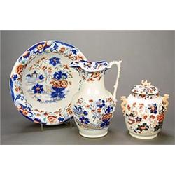 A Jonathon Lowe Chetham Stone China 'Amherst Japan' pattern ewer and basin, printed in blue and painted in rion-red, green and ochre with oriental buildings and flowering shrubs, the jug 32cm high, the basin 37cm diameter; and a similar ovoid two-handled pot pourri vase and pierced cover with dragon finial, 24cm high, printed marks, mid 19th century (minor damage and wear, pot pourri lacks liner) (see illustration) £100-150
