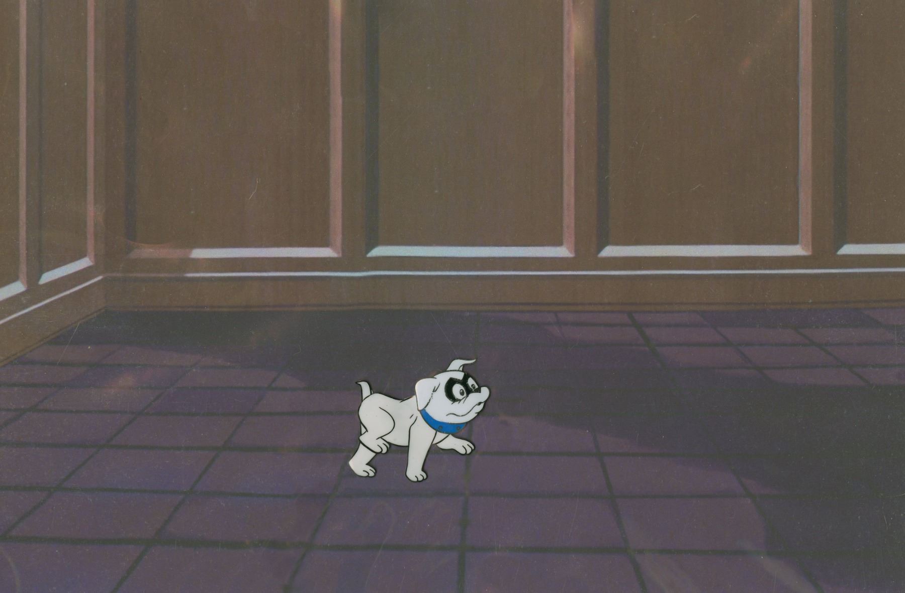 (Hanna-Barbera, 1964) An original multi-layer production cel of Bandit from the “Jonny Quest” episode “Shadow of the Condor.” Measuring 10” x 12.5” overall, with the character image measuring 2” x 1.5”, the piece is in good condition with slight paint loss around the face, a staple at the bottom, and light warping around the edges that do not affect the image. The cel is presented with a color copy reproduction background.