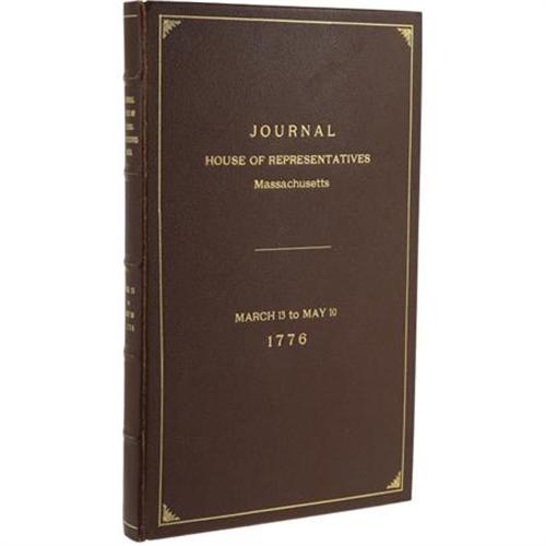 <B><I>A Journal of the Honorable House of Representatives. At a Great and General Court or Assembly for the Colony of Massachusetts-Bay in New England. March 13 to May 10, 1776</B></I></B></I> (Boston: Edes and Gill, 1776), first edition, 277 pages, untrimmed buckram, re-bound in leather (1969) with gold lettering and decorations, folio (9” x 14.75”). This rare volume documents the affairs of the Massachusetts Bay House of Representatives-including petitions, speeches, and reports on Indian activities-during a period in which Revolutionary goings-on continued to escalate throughout Boston. Among the more famous names is Paul Revere, mentioned on pages 105 and 275. There are extensive later notes written (in pencil) on the front endpapers, as well as handwritten notes (on legal-pad-size paper) inserted into (but not attached to) the book. The paper is in overall good condition with darkening and some foxing due to its age. The binding is in very good condition with only minor wear along the spine.<BR><BR><b>Shipping:</b> Books & Catalogs (<a target="_blank" href="http://www.heritageauctions.com/common/shipping.php">view shipping information</a>)