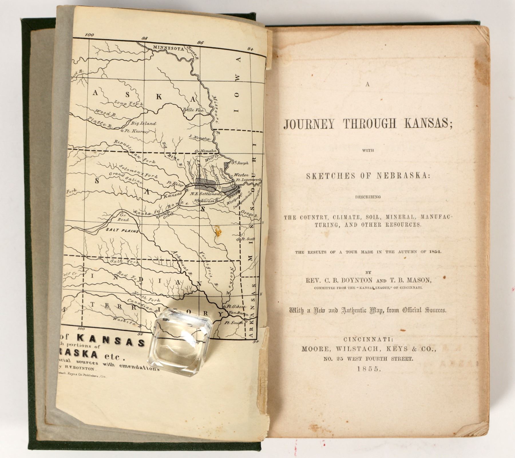 A Journey Through Kansas by Rev. C.B. Boynton & C,B, Mason, 216 pages, 1855. New binding. map in front , shows pikes peak. One of the earliest guides to the West. Includes stories of Indian fighting, voyage up the Mississippi, hunting on the plains and in the Rockies , and the prairie winters.