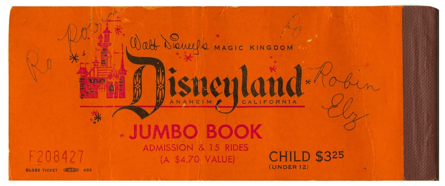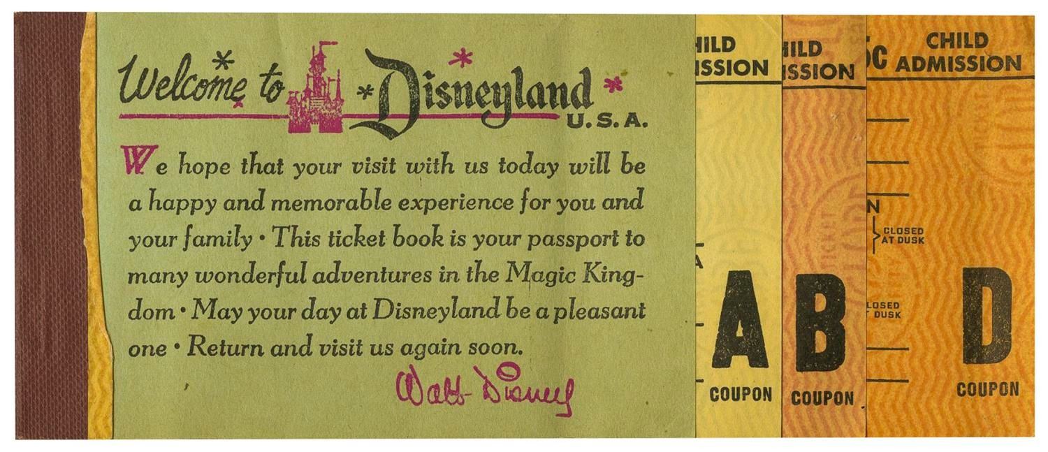 (Disneyland, 1958) A very rare Child Ticket Jumbo Book. Between 1957 and 1958, Disneyland experimented with a slightly larger ticket book. This book has been used, but retains the Welcome to Disneyland tab, two “A” tickets, a “B” ticket, and three “D” tickets which were the highest at the time. Long-gone attractions listed include Satellite-View of America, the 20,000 Leagues Under the Sea Exhibit, and the Rainbow Caverns Mine Train. Measuring 2.5” x 6”, the partial ticket book is in good condition, with wear typical of age and handling including creases from folding, edge wear, and and a name written on the back three times in ballpoint pen.