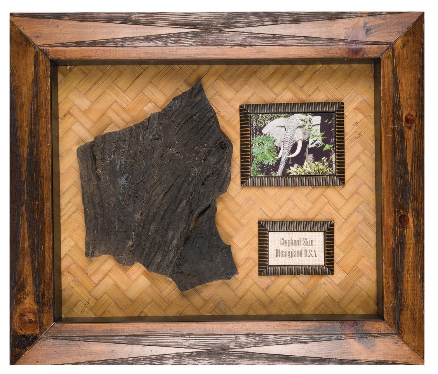 (Disneyland, 1990s-2000s) A segment of prop skin from an Audio-Animatronic Elephant featured along the Nile River of the Jungle Cruise at Disneyland. This textured synthetic hide belongs to either the first or second "most feared animal in the jungle." Measuring 6"x5", the skin fragment has been mounted in a custom 21.5"x25.5" wooden frame and is in very good condition with some surface wear from original outdoor display.