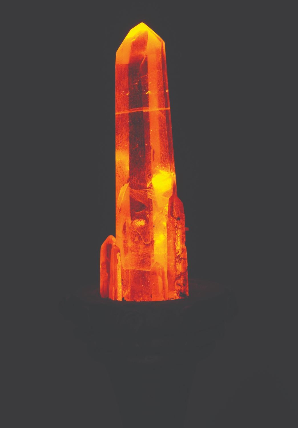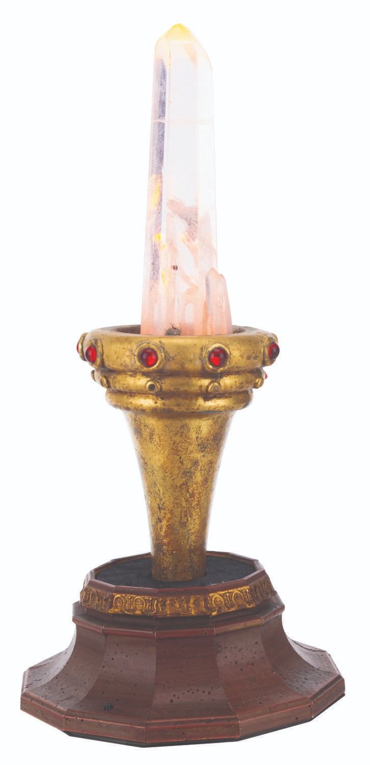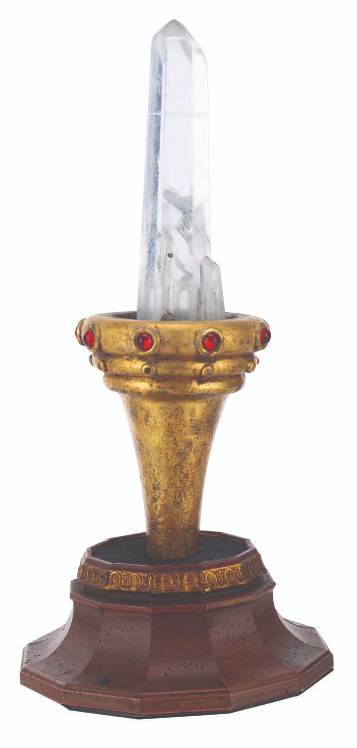 (Disneyland, 2000s) A crystal prop and its original hilt from the Jungle Cruise. This gold-painted base with red-jeweled accents was held by the statue of the Hindu god Hanuman, who was replaced by a statue of a cobra in 2021. The Park-used prop is housed in a custom display, which lights the crystal briefly when pressed. Measuring 13" tall and 4" in diameter, 16" tall 8" in diameter including its display, the prop from the classic Adventureland attraction is in good condition with cracks, paint loss, stains, scuffs, missing jewels, and wear from Park use, with the bottom cover of the case loose.