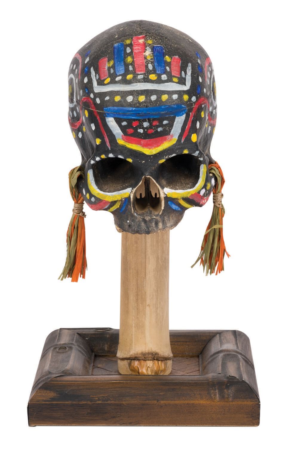 (Disneyland, 1970s) A skull prop from The Jungle Cruise at Disneyland. The prop skull is decorated with tribal patterns in primary colors of red, blue, and yellow with white accents. Measuring 7" tall and 6.5" wide, the prop skull has been mounted atop a bamboo segment and 8"x8" wooden base. The entire piece stands 14" tall and displays in fine Park-used condition.