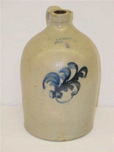 A.K. BALLARD 2 GAL. JUG W/ COBALT LEAF DECORATION- BURLINGTON VT - SIDE BODY CHIP