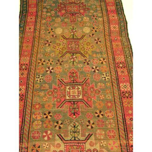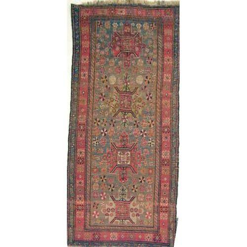 A KAZAK RUG<BR><BR>In tones of green, red, and blue, worn, 6`8"l x 4`w