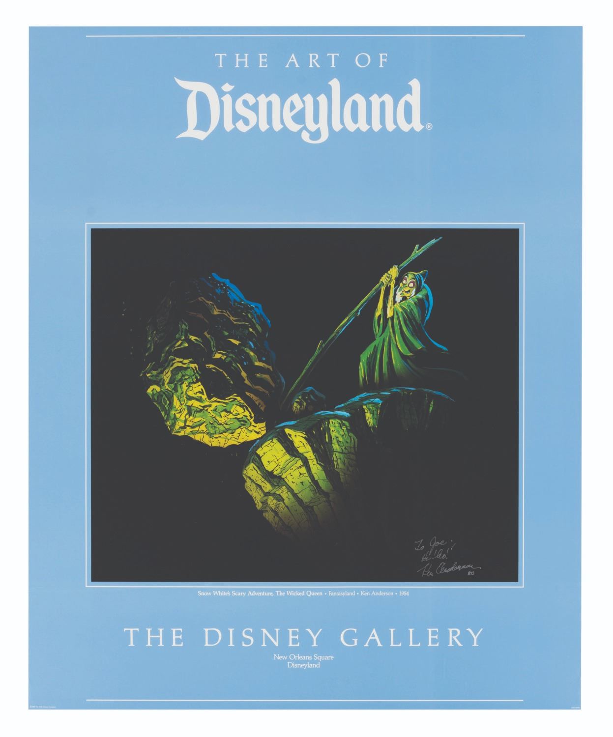(Disneyland, 1988) A beautiful signed concept poster of the Evil Queen in her hag disguise from Snow White's Scary Adventures, sold as part of the Disney Gallery's "The Art of Disneyland" series. Animator and Imagineer Ken Anderson signed the poster in silver marker with the personalized message, “To Joe - Hello! Ken Anderson 88.” Measuring 26” x 32”, the poster displays in fine condition with minor creases.