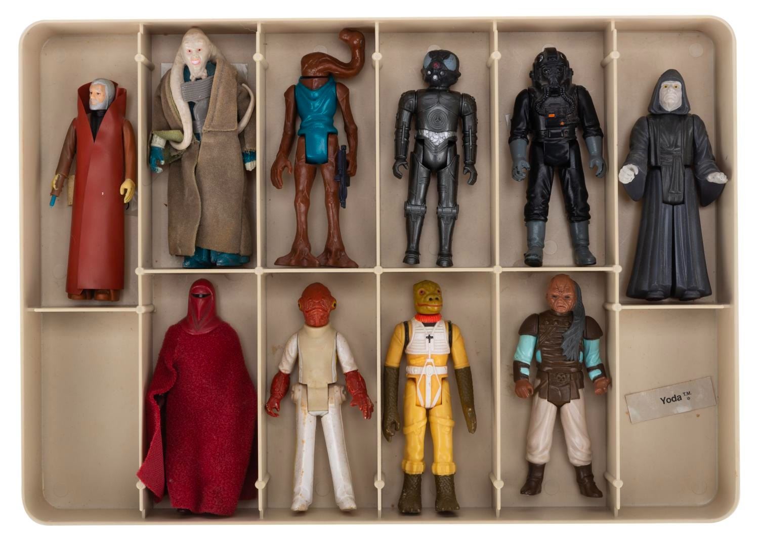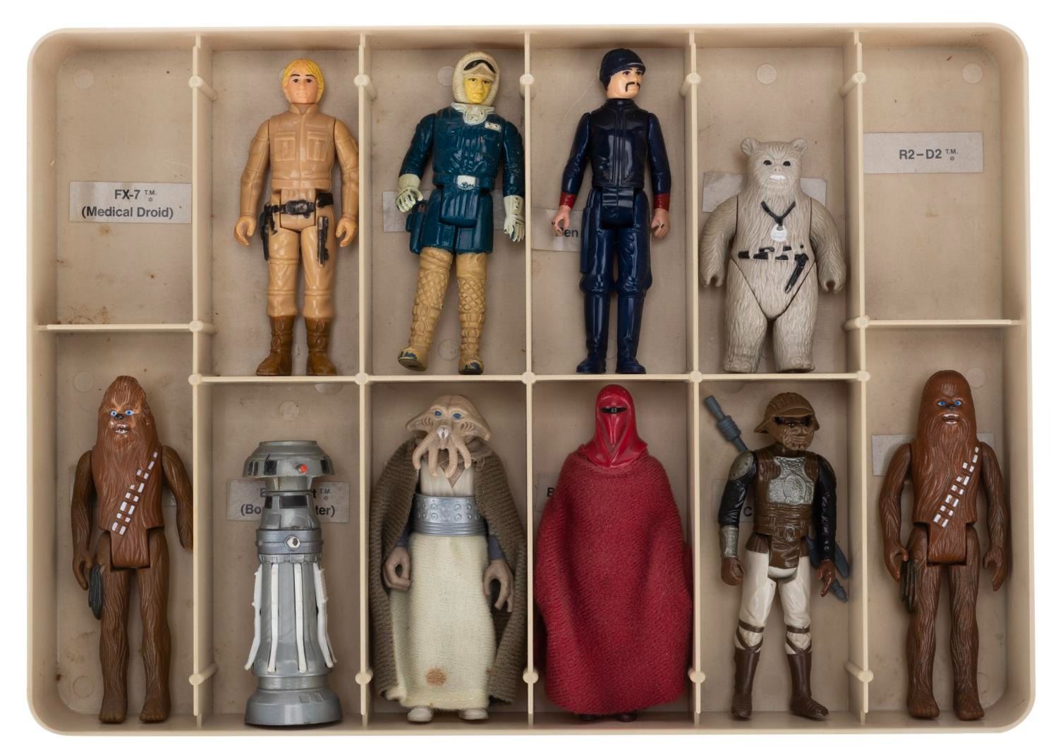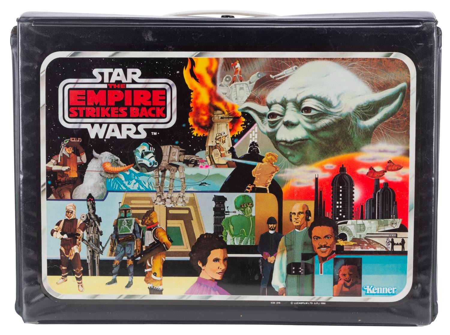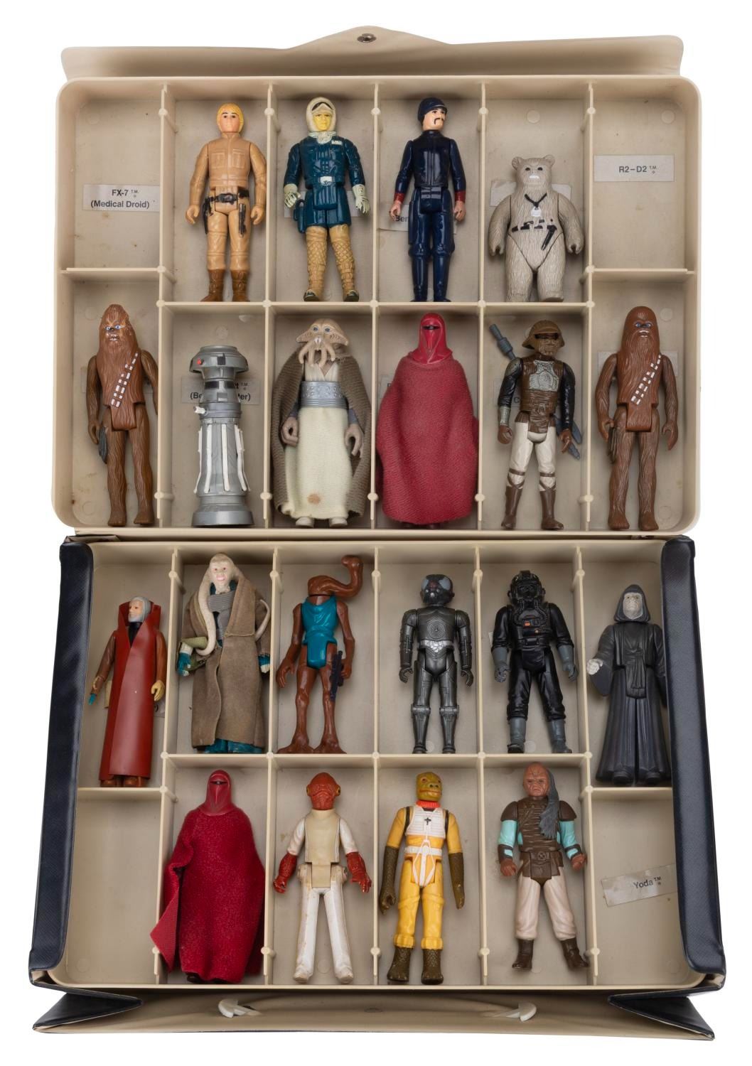 (Kenner, 1980-83) An action figure case featuring"The Empire Strikes Back" art, with 19 early Kenner Star Wars action figures inside. The only accessories included are Lando’s helmet and weapon, and Hammerhead’s gun. Measuring 9" x 12" x 3", the case exterior displays in very good condition with light scuffs and scratches. The interior trays are in good condition, with typical scuffs and wear from use. The action figures are overall in good condition, many with typical wear from play including scuffs and paint loss, and some tackiness to the touch from age. Obi Wan’s light saber tip is broken, the medical droid has a missing arm, and one Chewbacca is in poor condition with a massive head wound and missing hand.