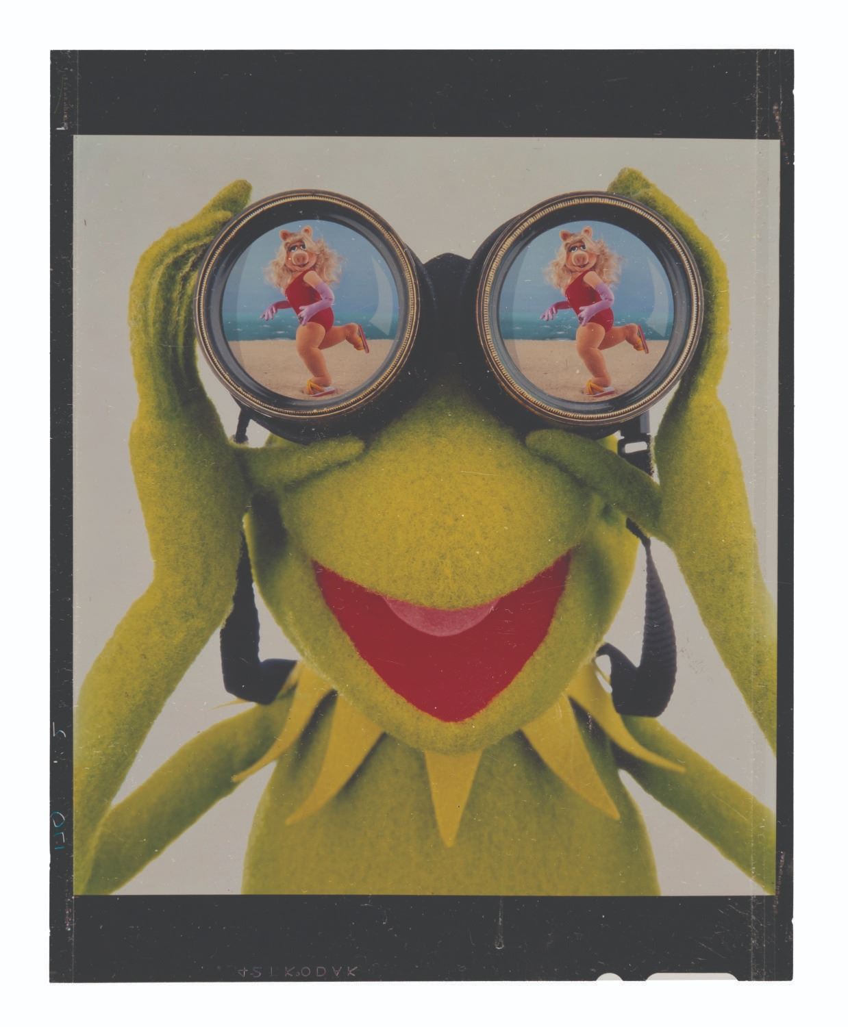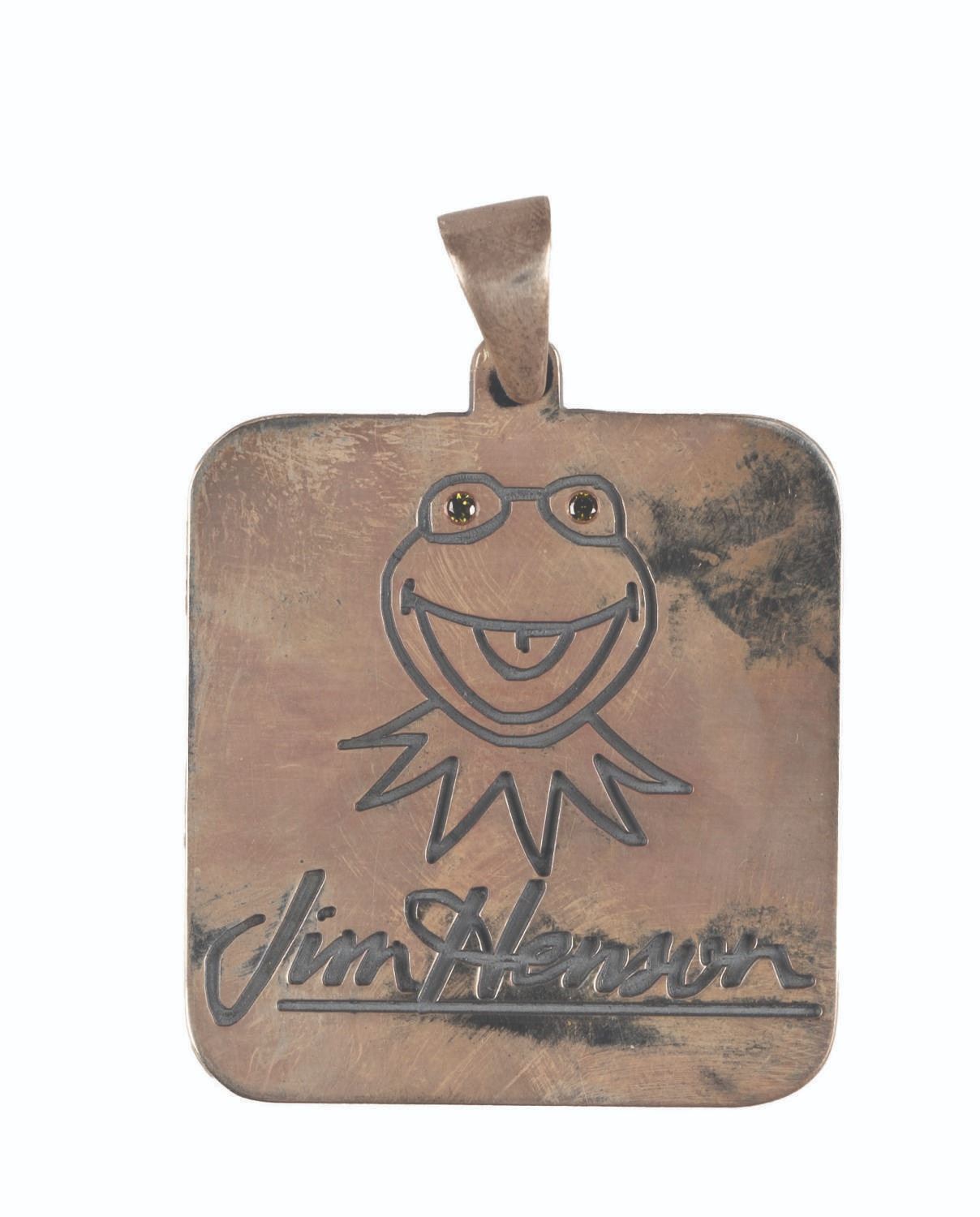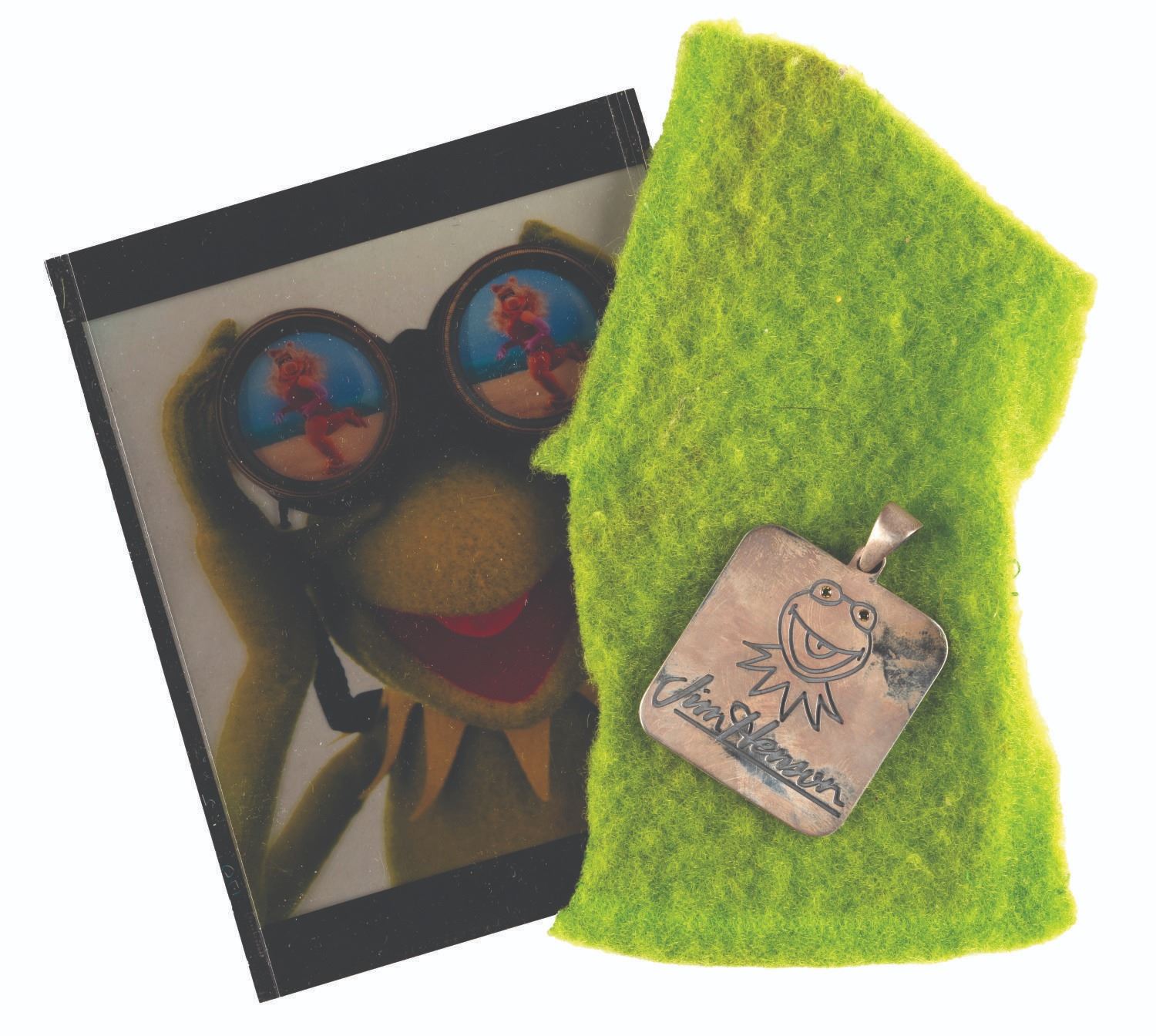 (Disney, 1990s) A swatch of Kermit the Frog puppet fabric, a photo transparency, and a crew gift Jim Henson medallion. The transparency was used for the 1997 Muppet Parody Calendar: The Sequel and the solid sterling silver medallion, given to the crew, features an embossed Jim Henson signature and Kermit with faux green jewels for eyes. Measuring from the 1.5” x 1.5” medallion to the 5” x 3.75” transparency, the items display in very good condition with light stains to the reverse side of the fabric, light scratches to the transparency, and light tarnish to the medallion.