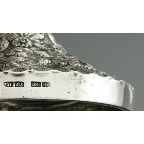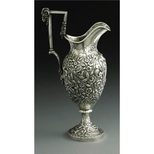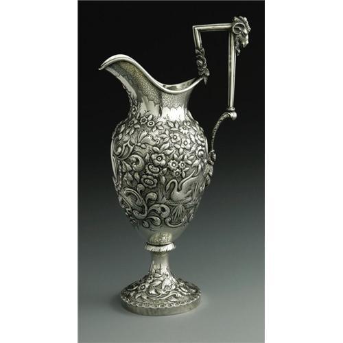 <B>An American Silver Ewer</B></I><BR>The Kirk Corporation, Baltimore, MD, c.1830<BR><BR>The footed repousse ewer decorated with a heavy floral pattern overall, a swan to one side and butterfly to the other, blank cartouche to the front, raised geometric handle with applied ram's head, total weight 46.1 Troy ounces, marked to the side of the foot <I>SK 11oz</B></I><BR>15.7in. high