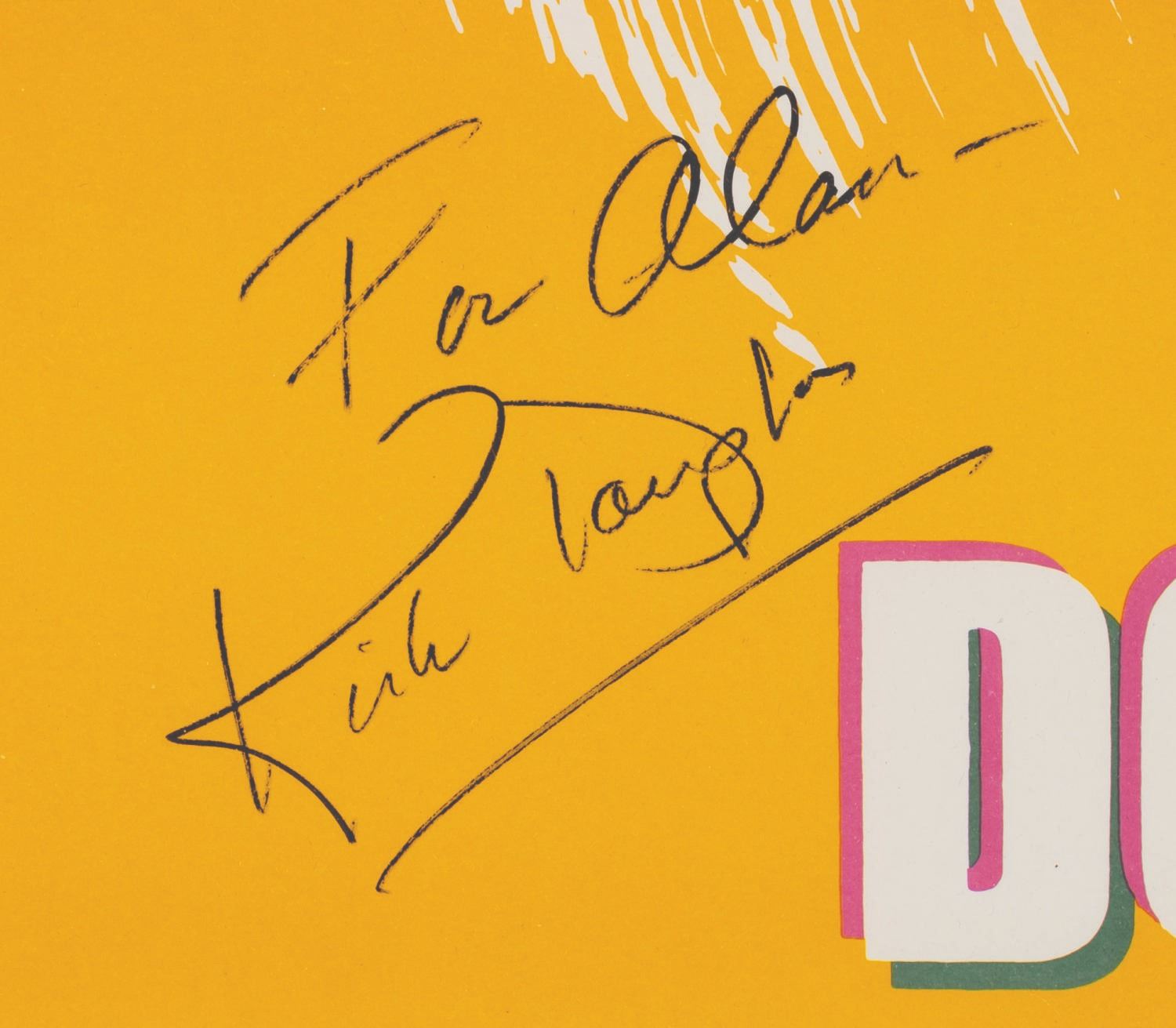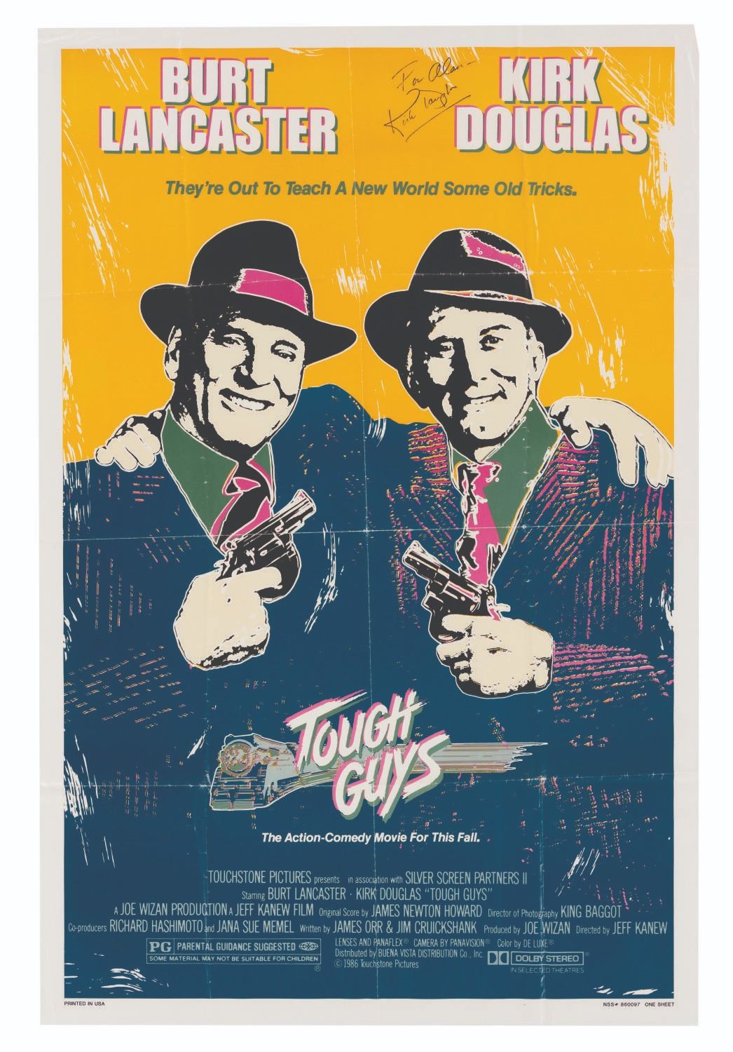 (Touchstone, 1986) A one-sheet poster for the original release of "Tough Guys,” signed with a dedication in ink by Kirk Douglas. Measuring 27” x 41”, the poster displays in good condition with typical wear and creases along the original folds and corners.
