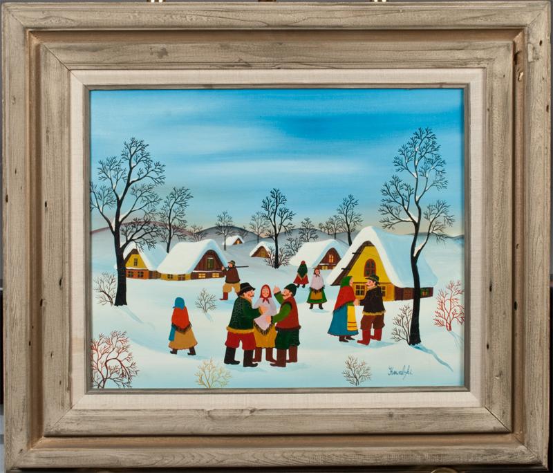 Depicting figures in a winter village scene. A. Kowalski, (1925-), Polish/Hungary. Signed Kowalski in LR, 15.5" H x 19.5" W (sight) with 4.75" for frame.