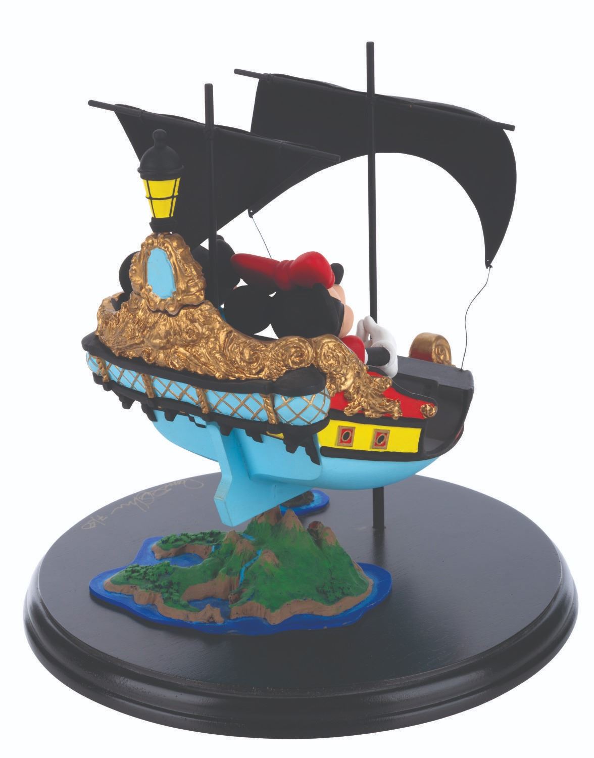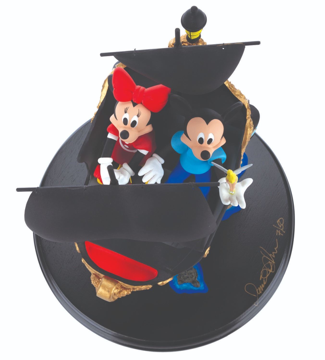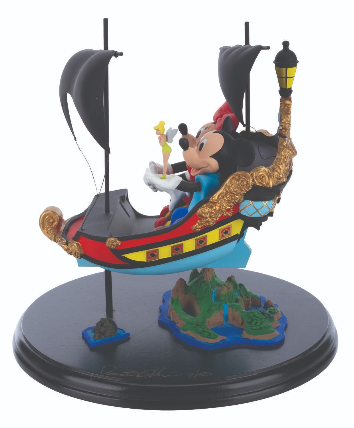 (Disney, 2002) A hand-cast and painted figurine of Mickey, Minnie, and Tinker Bell aboard Peter Pan’s Flight, released in a limited edition of only 50. Artist David Kracov signed the base and numbered it 7/50. This sculpture is one of the first Krakov created for Disney, and a larger edition of 1500 was mass-produced in resin. Measuring 9.5" x 9" in diameter, the sculpture is in fine condition.
