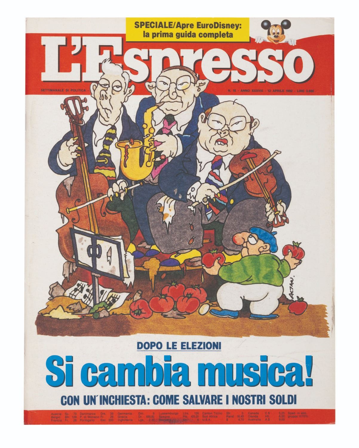 (L’Espresso, 1992) An issue of the L’Espresso (No.15; April 12, 1992) magazine with an article on the opening of Euro Disney Resort. The French-language magazine features a 12-page article titled "All The Power to Mickey Mouse," containing a guide to the new Park and a story on its surrounding controversy. Measuring 8" x 10.5", this magazine is in very good condition with minor scuffs and wear from handling and age.
