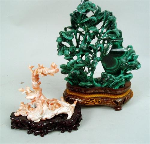 A LAPIS-LIKE COMPOSITION FIGURAL, urn with foliage, together with coral tree with bird, 7"h