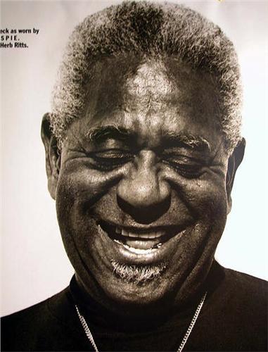 A LARGE AUTOGRAPHED WINDOW POSTER FROM THE GAP STORE Depicting a black and white photograph of a laughing Dizzy Gillespie, printed at top left "Gap Mock Turtleneck as worn by Dizzy Gillespie/Photographed by Herb Ritts" and across the bottom "STYLE BEYOND RULES. PURE GAP./GAP", double-sided with the words appearing backwards on the other side, signed "Be Bop/Dizzy Gillespie '90", this poster was created for Gap's "Individuals of Style" ad campaign and most likely hung in a store at some time, small tear at top, 47 1/2"w x 68"h