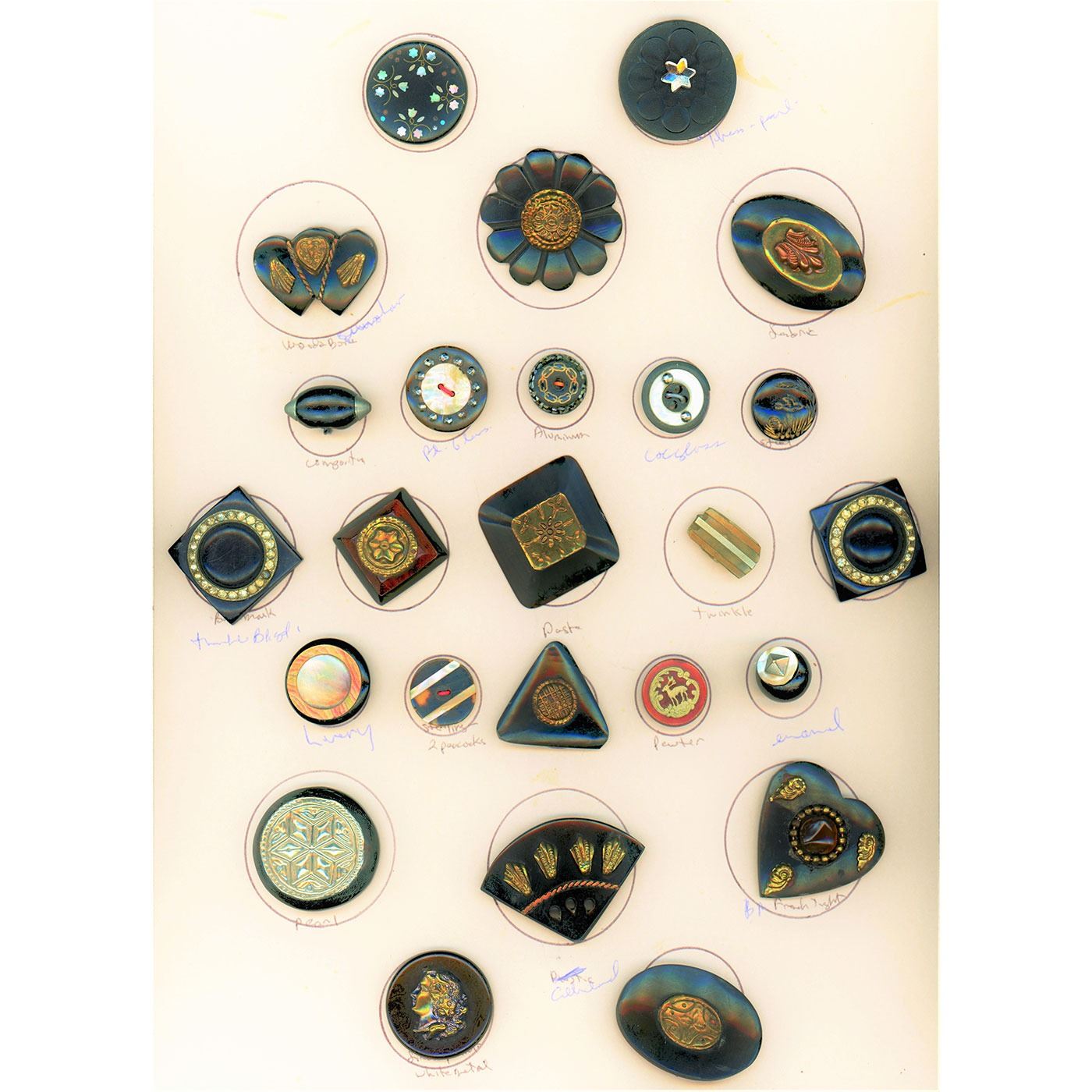 25 S/M/L 19th and 20th century assorted materials spec. to black. This is a very unusual collection. It includes mostly black buttons of horn, composition, celluloid, Bakelite, casein and maybe more. Sime really nice examples.