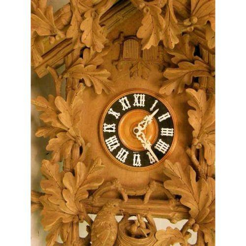 A LARGE CARVED MAPLE CUCKOO CLOCK<BR><BR>In the Black Forest tradition, the dial stamped "Made in Germany," 36"h x 22"w x 15"d