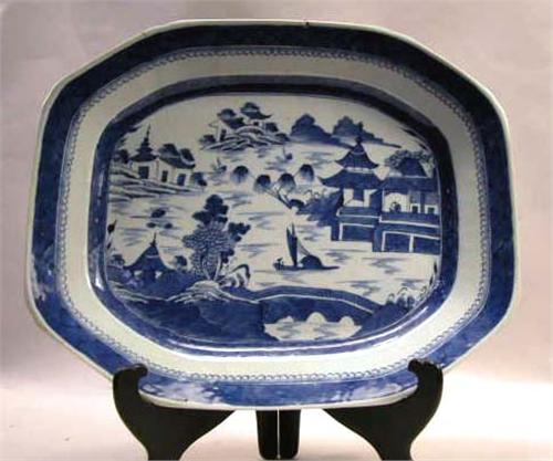 A LARGE CHINESE EXPORT PORCELAIN OCATAGONAL CANTON SERVING DISH; Chip and hairline, 20"w