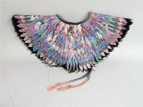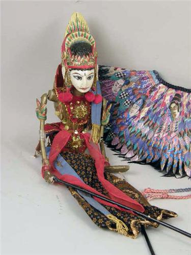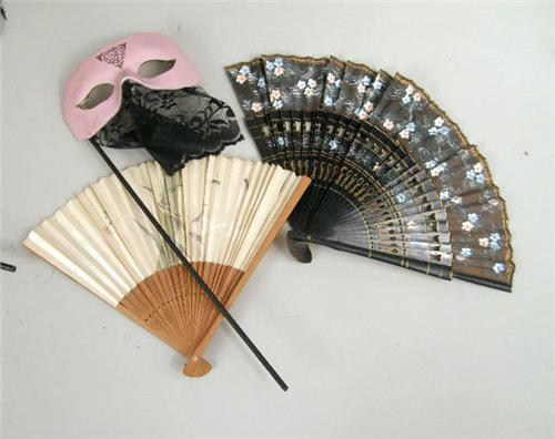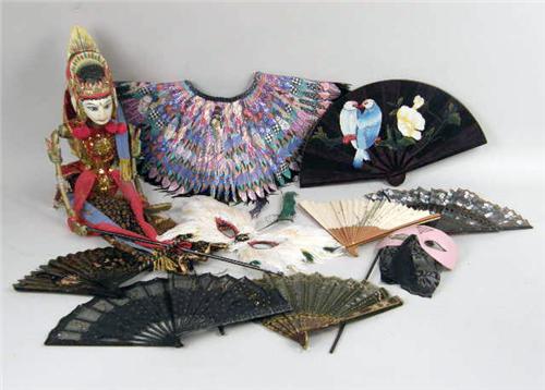 Including a a carved antelope, a wooden mask, an elaborately woven raffia, bead and metal headdress, an Indonesian shadow puppet, several Venetian carnival-style masks, a painted feather collar and assorted fans of silk, cotton, lace, straw and paper. Approximately 22 pieces.