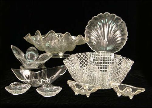 Comprising dishes in the shape of giant clam shells, a bird, a flower and scallop shells, a large cross-hatched fluted-edged punch bowl, a turtle-shaped magazine rack with metal accents, a covered clamshell serving dish and several racks or stands. Approximately 32 pieces. From 6"w to 20"w