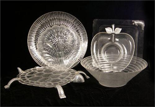 Comprising dishes in the shape of shells, square-shaped with pig-form metal handles, an apple-shaped bowl with metal accents, a turtle-shaped bowl with metal accents, three round bowls and two round platters.