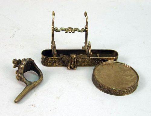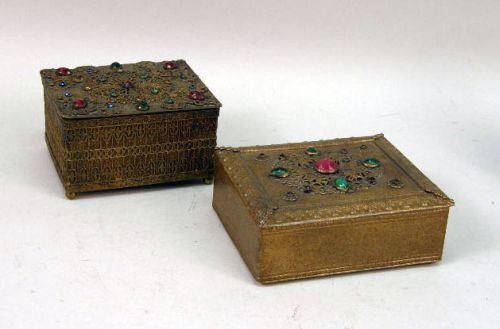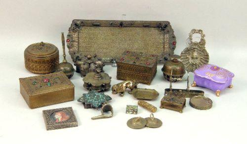 Comprising 6 faux-jeweled items, those being 2 trays, 3 boxes and a matchbox holder, 2 stamped "Apollo", 2 Indian make-up containers, a scallop shell-shaped door knocker, 2 painted elephant bells, a pair of finger cymbals stamped "M. IN SYRIA", a crouching tiger, a turquoise-encrusted Islamic pendant, an enameled filigree pill holder, a monogrammed cigarette case, a tiny Chinese enameled pill box, an archer`s thumb ring and a piece from a desk garniture set. Together with a faux-jeweled purple and gilt-painted porcelain trinket box. 21 pieces.