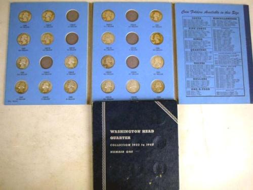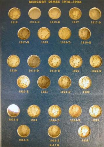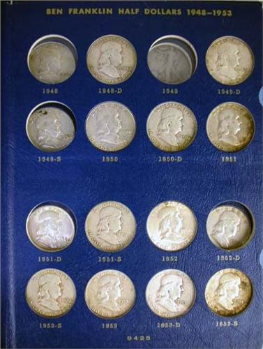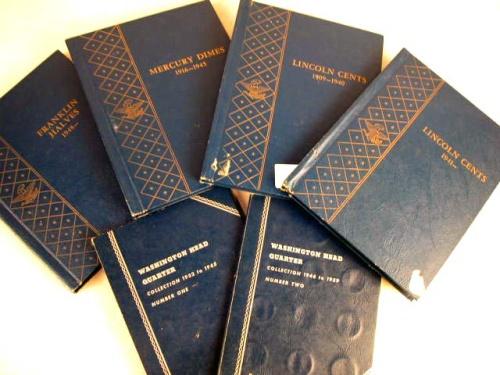 A LARGE GROUP OF COINS IN ALBUMS Comprising, twenty-six 1948-1962 Franklin silver half-dollars, fifty-two 1916-1945 mercury dimes, sixty 1941-1950 wheat pennies, thirty-one 1943 steel pennies, twenty-one 1913-1940 wheat pennies, twenty-eight 1946-1959D Washington head silver quarters, and twenty-one 1932-1945S Washington head silver quarters, various dates and conditions