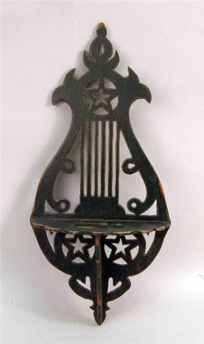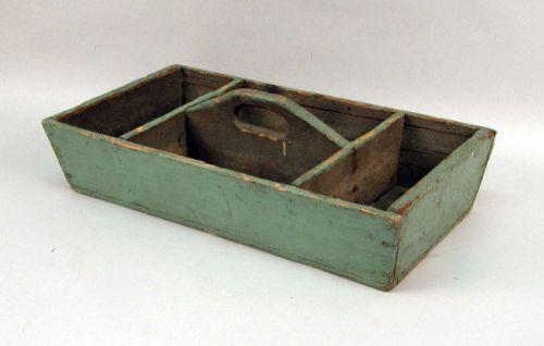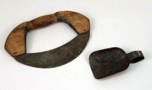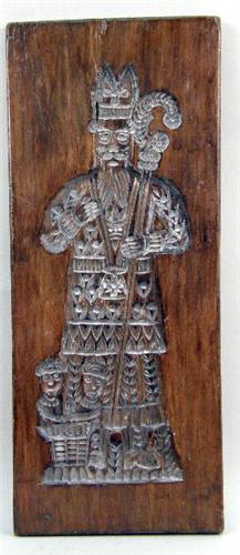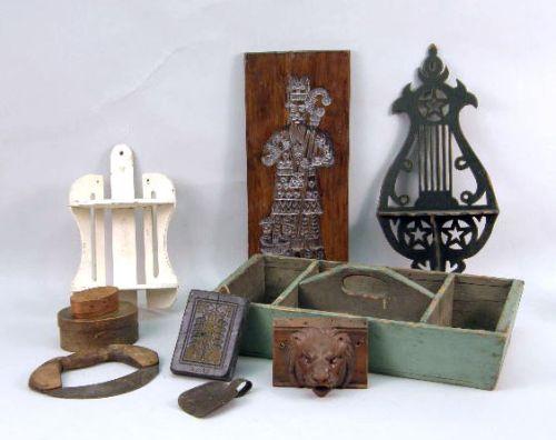 Comprising a large carved springerle cookie mold, two small hanging shelves, two pantry boxes, one a rare "C.H."-stamped example, the other with the faded inscription, "E.A. Chandler/Springfield Mass./Died June 21, 1888", an old chopper, a carved lion`s head, probably from a piece of furniture, and a green-painted berry carrier. Together with an old tin scoop and a wax mold. 10 pieces.