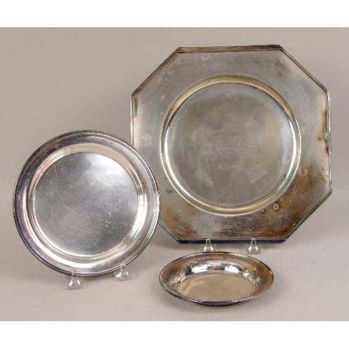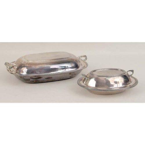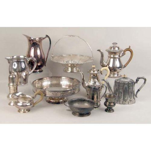 A LARGE GROUP OF VICTORIAN SILVER-PLATE HOLLOWWARE<BR><BR>Including: water pitchers, entree dishes, compotes, sugar caster, sauce boats, tea pots, coffee pot, trays, and salvers. 19 pieces
