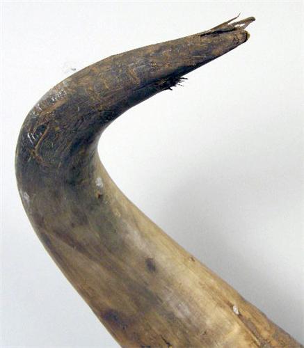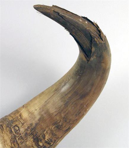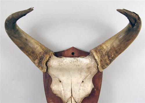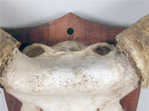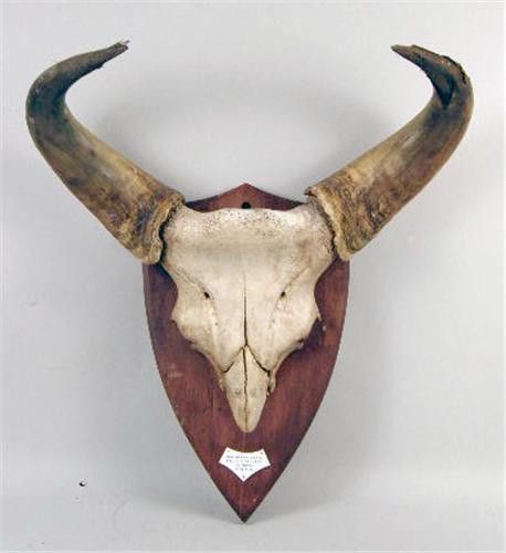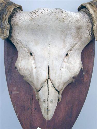 <b>A LARGE HORNED SKULL, POSSIBLY A MUSK OX OR WATER BUFFALO, MOUNTED ON A WOODEN SHIELD</b>