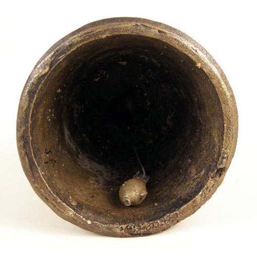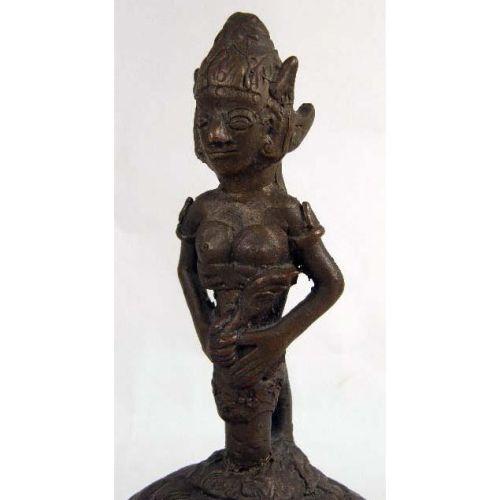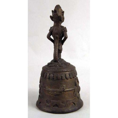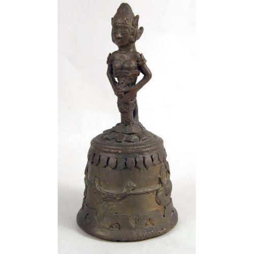 A LARGE JAVANESE CAST-METAL FIGURAL BELL<BR><BR>with applied crab ornamentation, the handle being a female Naga serpent, the body of the bell incised JAVA. 11" h.