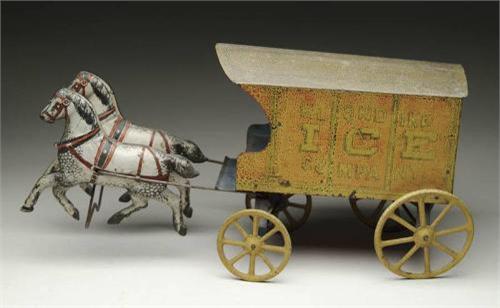 A LARGE LITHOGRAPHED KLONDIKE ICE HORSE DRAWN WAGON. Wagon is lithographed in red with stenciling of "Klondike" on both sides. On back "Danger Keep Off". Also has yellow wheels, brown roof and two dapple horses in stride pulling cart. Circa 1900. SIZE: 17" l x 9-1/2" h. CONDITION: Paint separating on back of cart. Wear to wheels and seat. 1-4941 MC