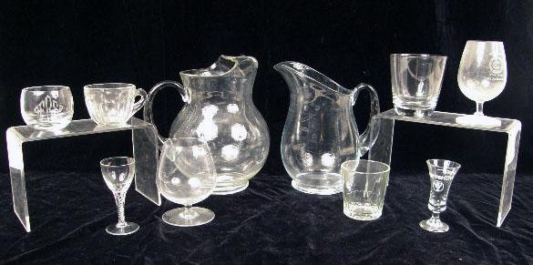 Comprising two pitchers, twelve cordial glasses, seven shot glasses, twenty-two punch cups, eight brandy snifters, four wines, six scotch glasses and four old-fashioned glasses. Approximately 65 pieces.