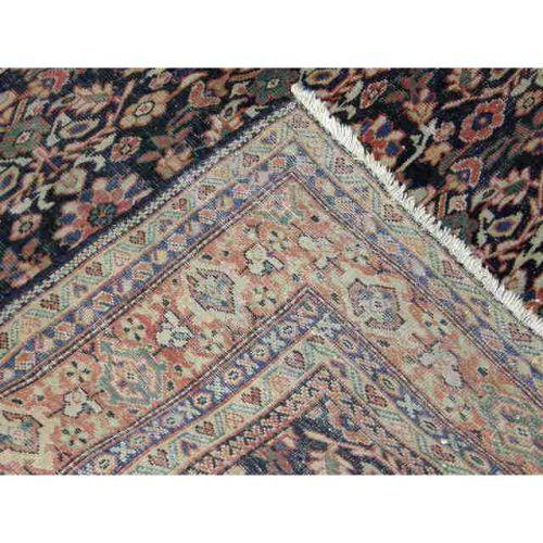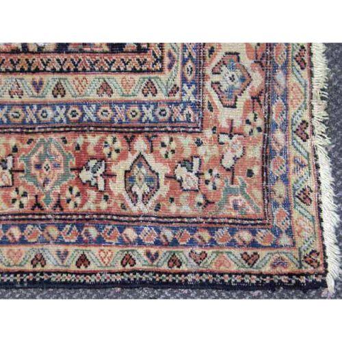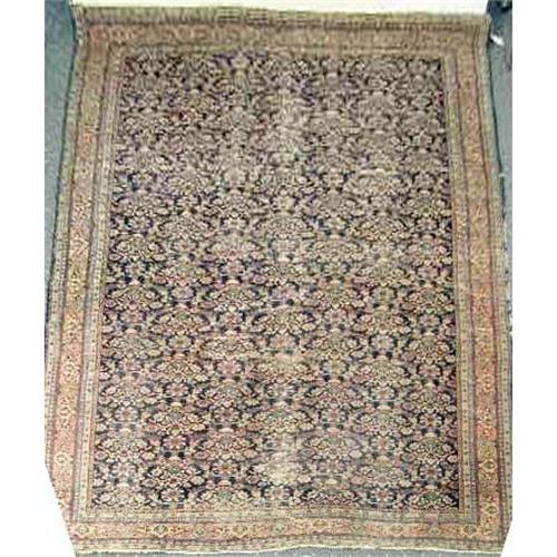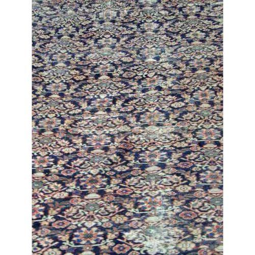 A LARGE ORIENTAL RUG<BR><BR>Worked in polychrome with repeating floral motifs in a navy field, worn throughout, 22`l x 17`w