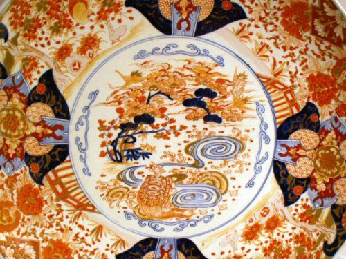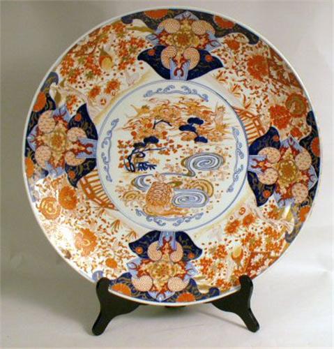 Japanese, with a coral, blue, and gold floral motif. 22 1/2"dia.