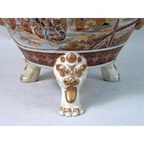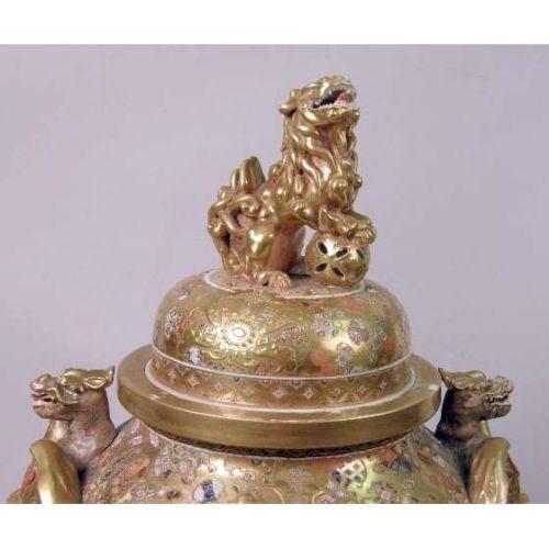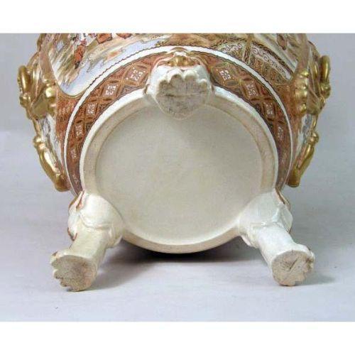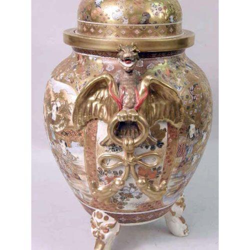 A LARGE SATSUMA COVERED VASE WITH FIGURAL HANDLES<BR><BR>Japanese, 17"h x 15"dia.